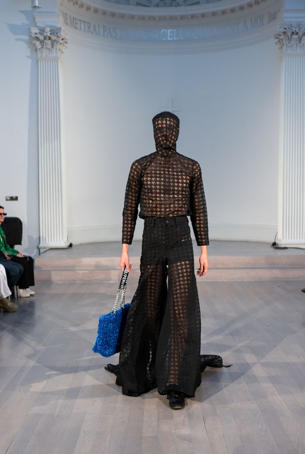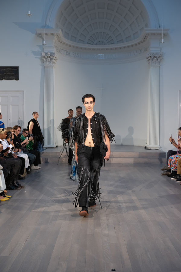 Genaro Rivas, the recent winner of The Visa Young Creators: Recycle the Runway competition hosted by Vogue Business, unveils his complete menswear debut in London, presenting a darkly poetic, sustainable vision.