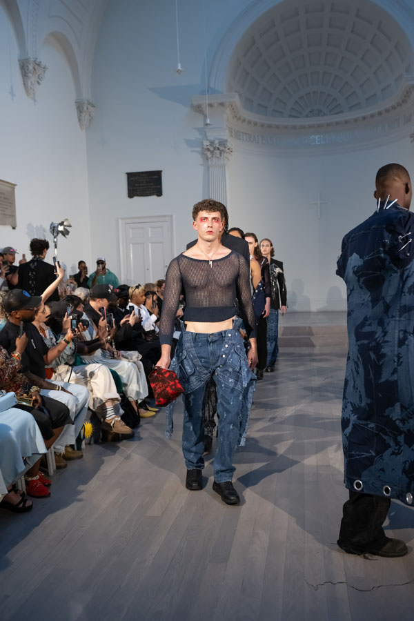 Following a striking preview at Berlin Fashion Week, Peruvian designer Genaro Rivas brings his full menswear collection, A Feast for Crows, to London. This move reaffirms his commitment to purpose-driven fashion through a new material focus: denim. This marks Rivas’s first foray into the fabric, and true to form, he defies convention.