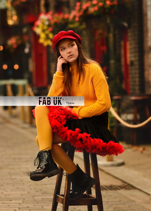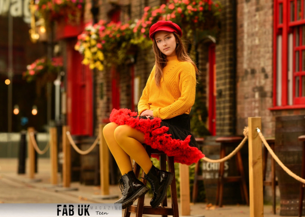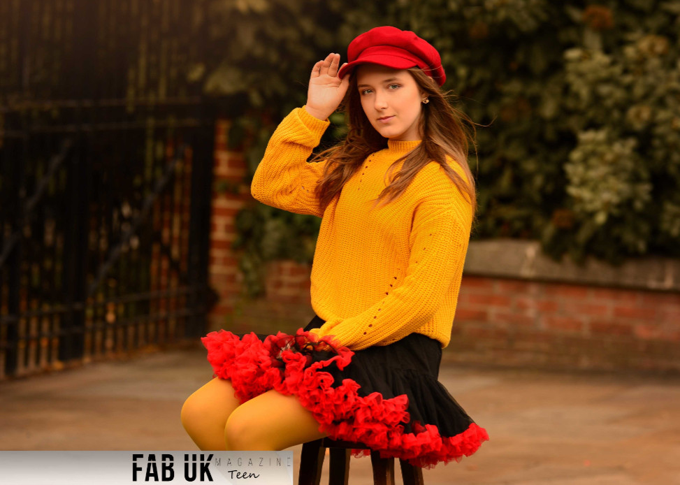 Her outfit is flowy with beautiful ruffles and a pleated design. The beret strengthens the image, pulling the whole look and background together, almost merging it into the same thing. As well as the boots, an additional, little something to the look.