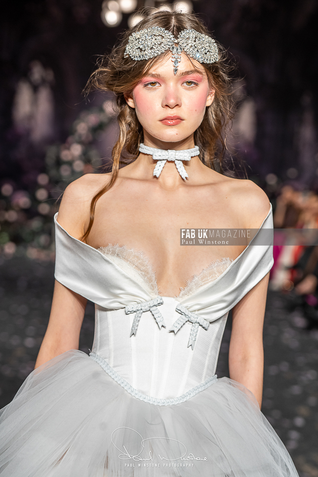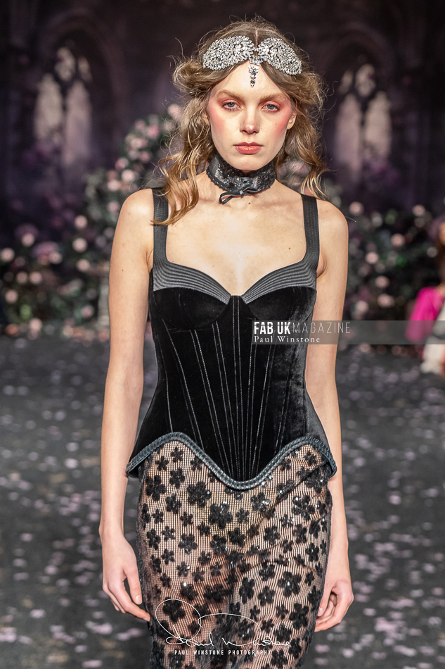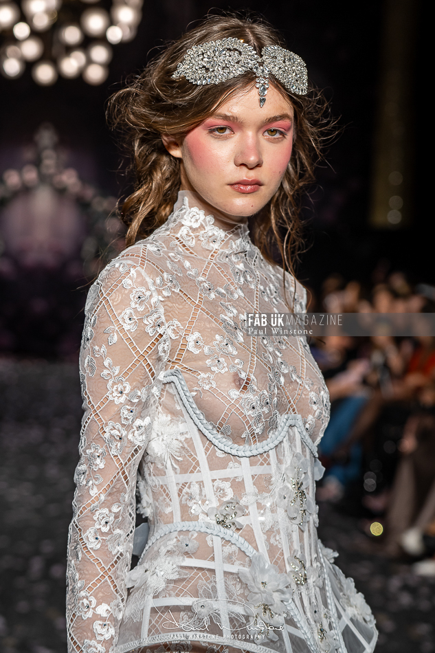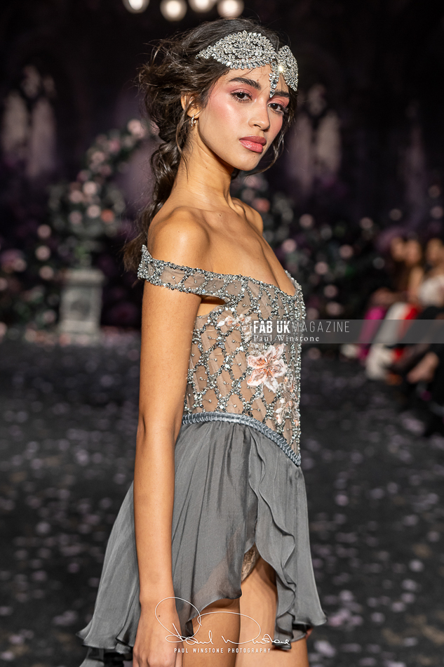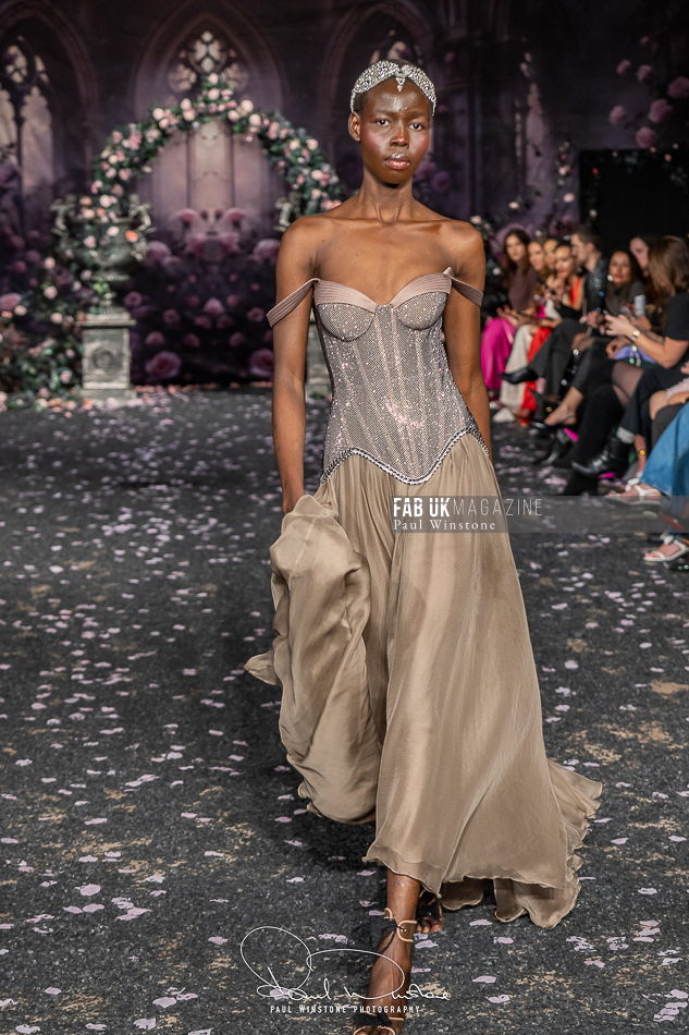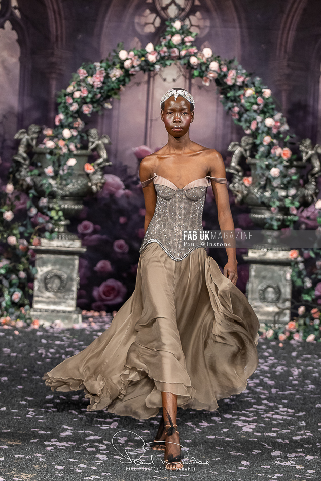 Structured corsetry and sharply contoured bodices echoed the resilience of battle armour, while fluid fabrics and cinched waists expressed sensuality and grace. Intricate crystal embellishments shimmered beneath the runway lights, symbolising heavenly visions and sacred destiny.