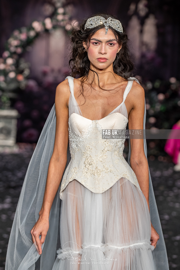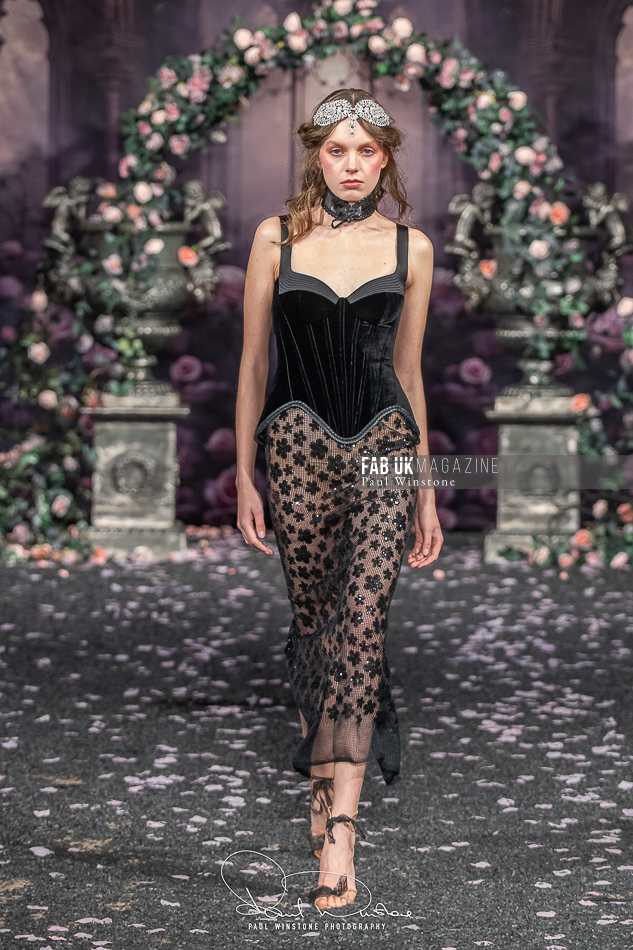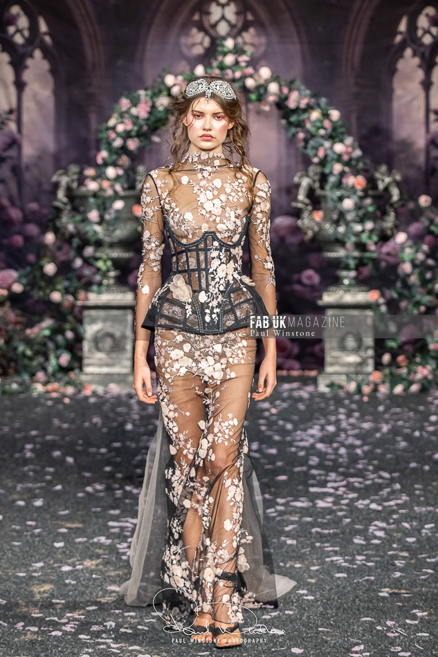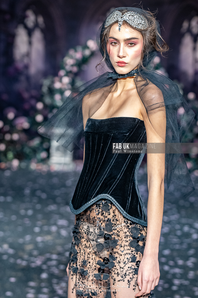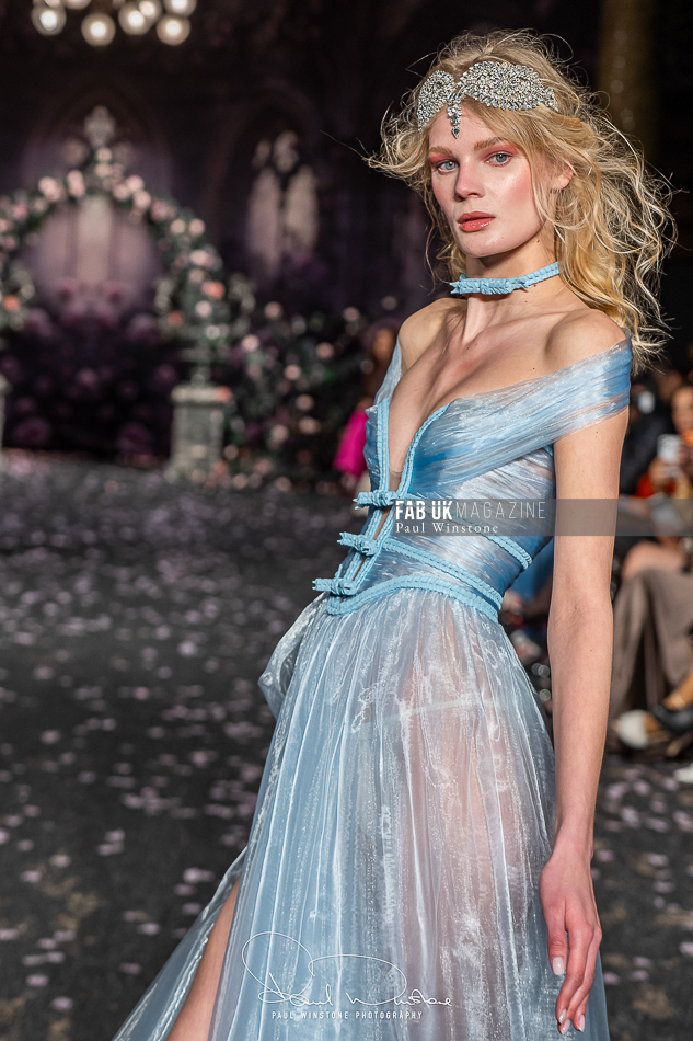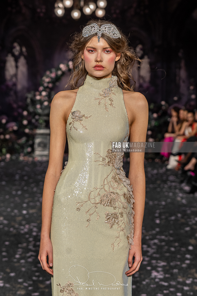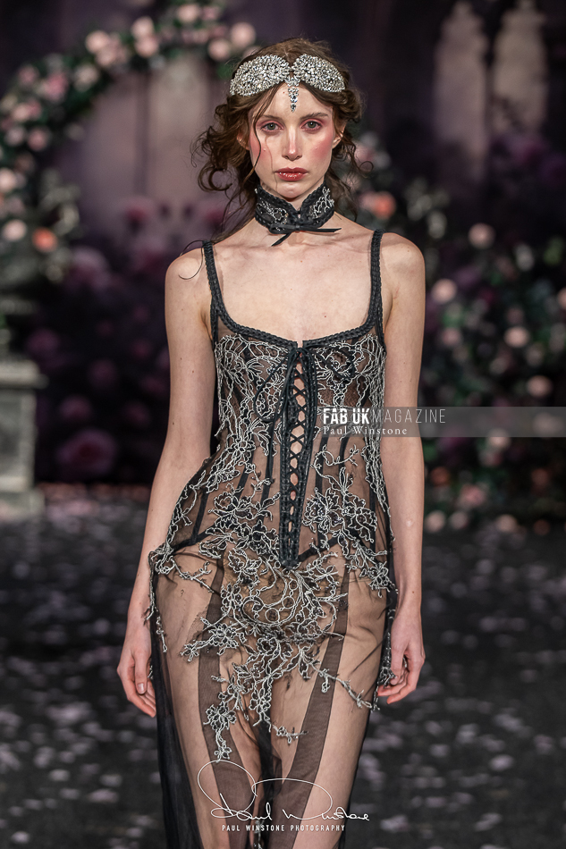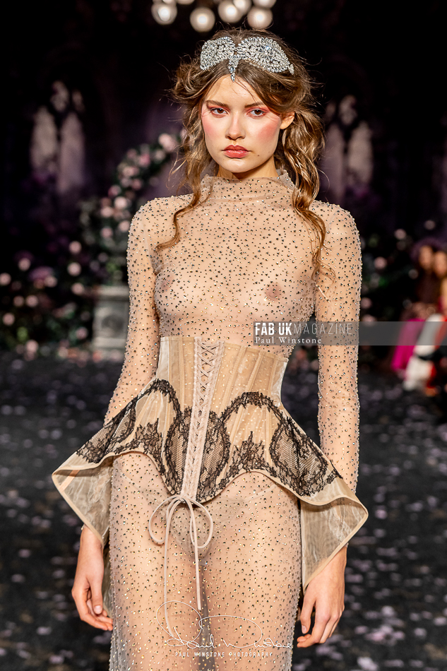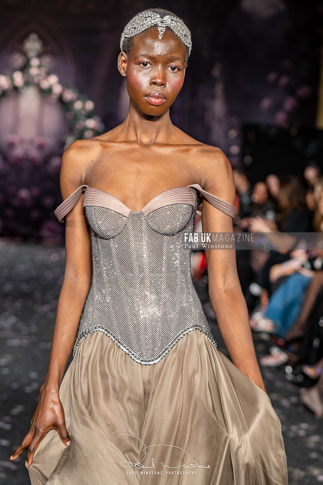 Structured corsetry and sharply contoured bodices echoed the resilience of battle armour, while fluid fabrics and cinched waists expressed sensuality and grace. Intricate crystal embellishments shimmered beneath the runway lights, symbolising heavenly visions and sacred destiny.