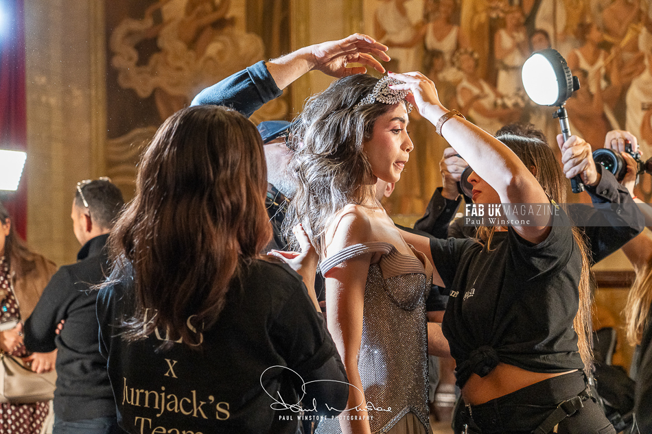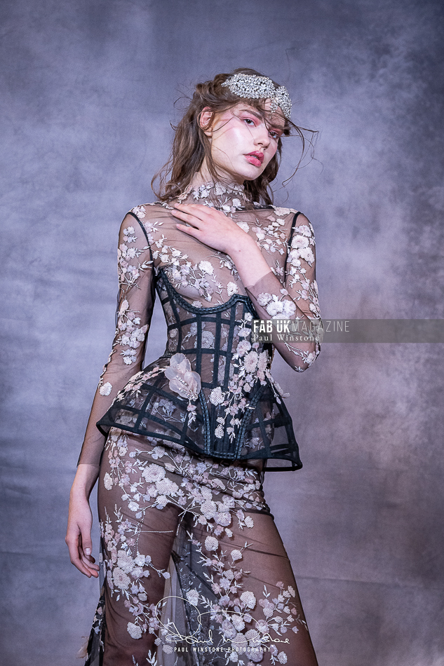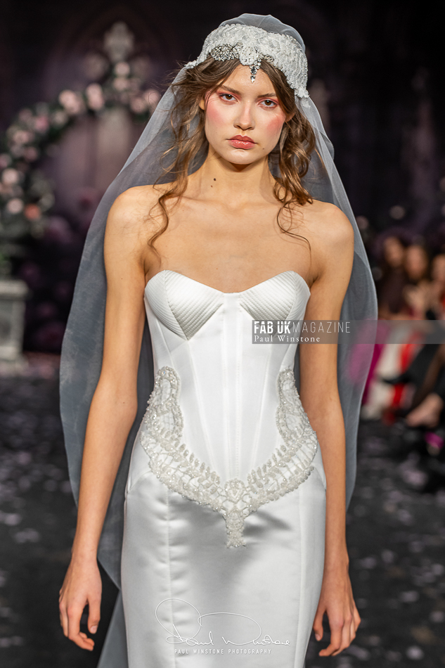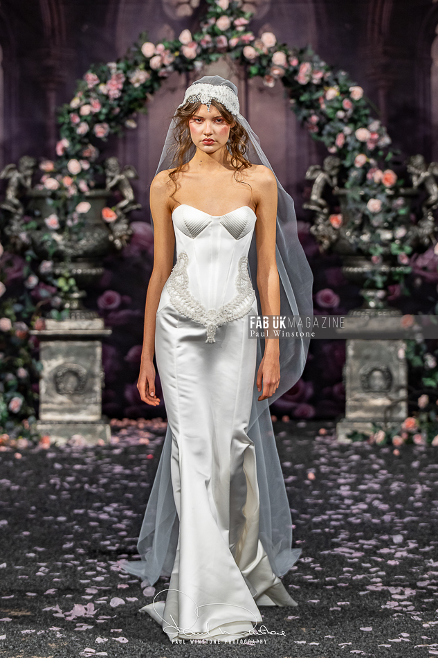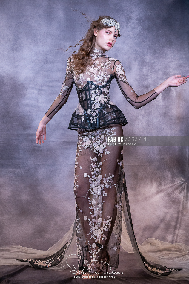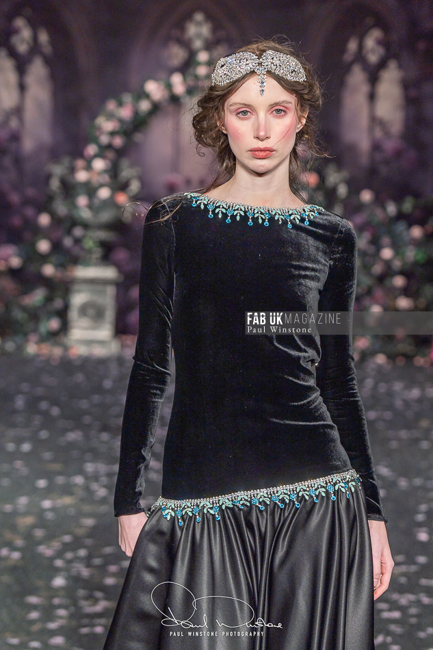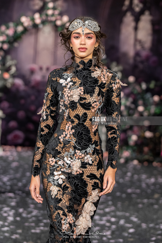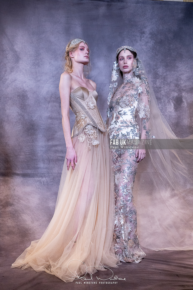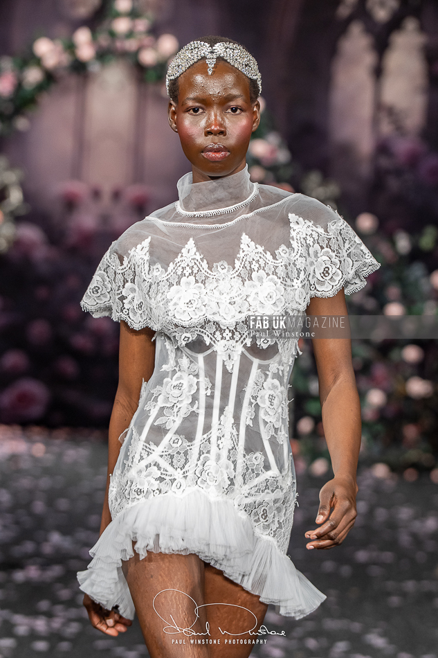 Structured corsetry and sharply contoured bodices echoed the resilience of battle armour, while fluid fabrics and cinched waists expressed sensuality and grace. Intricate crystal embellishments shimmered beneath the runway lights, symbolising heavenly visions and sacred destiny.