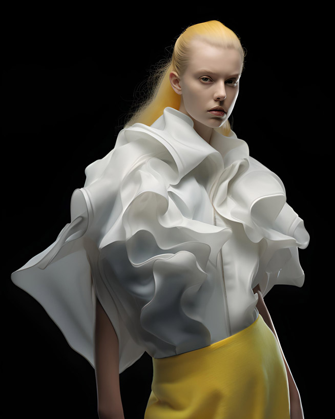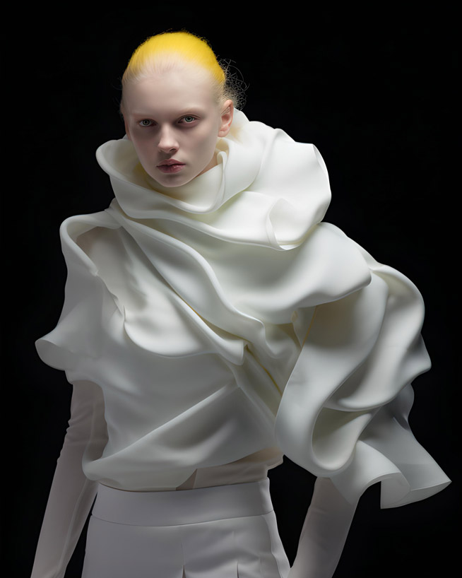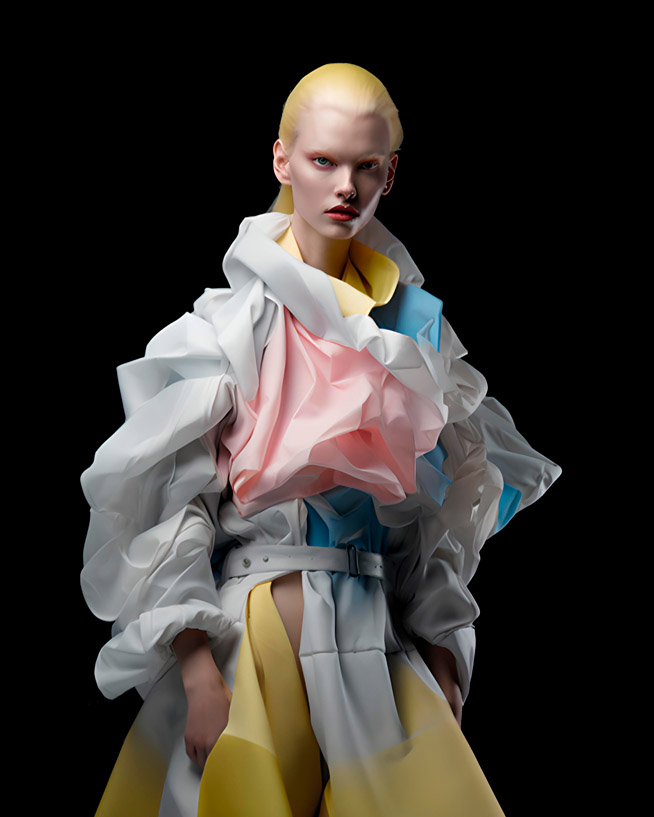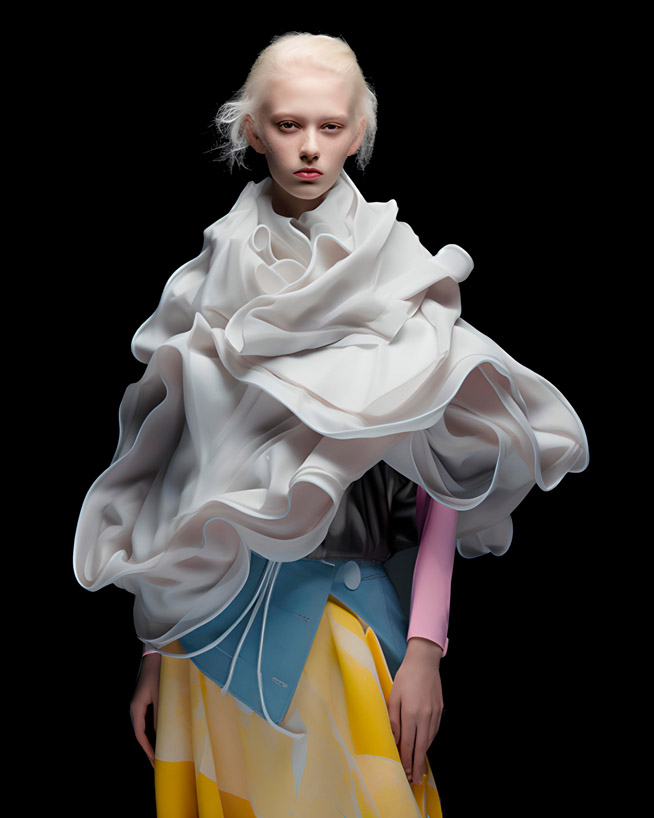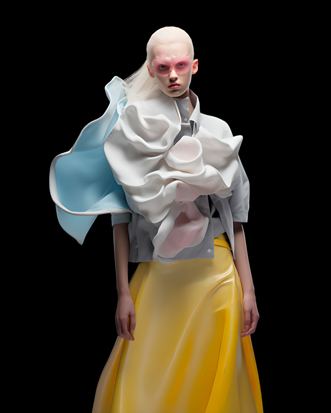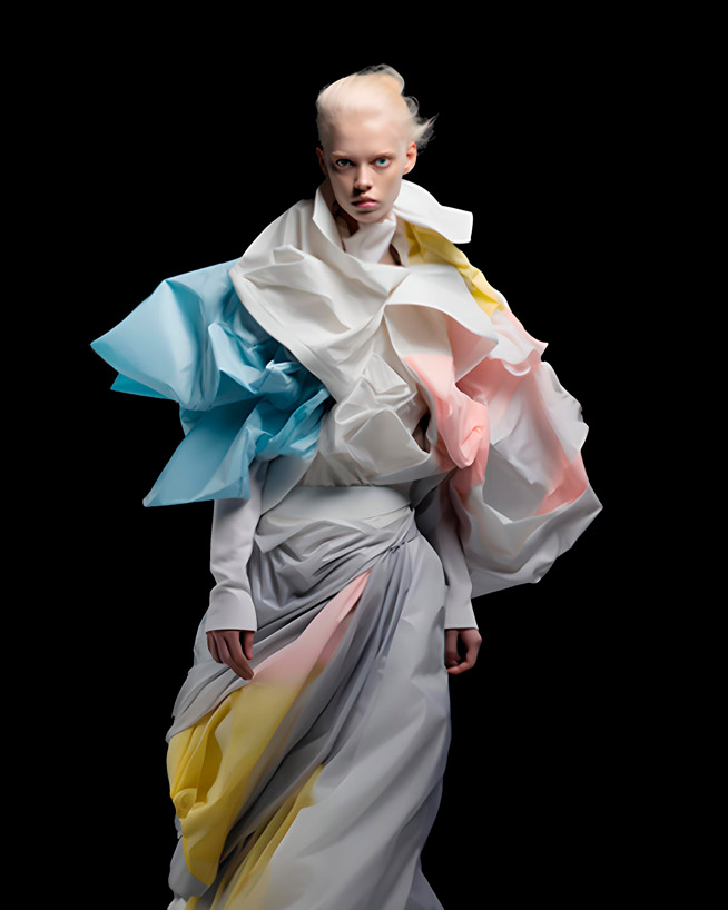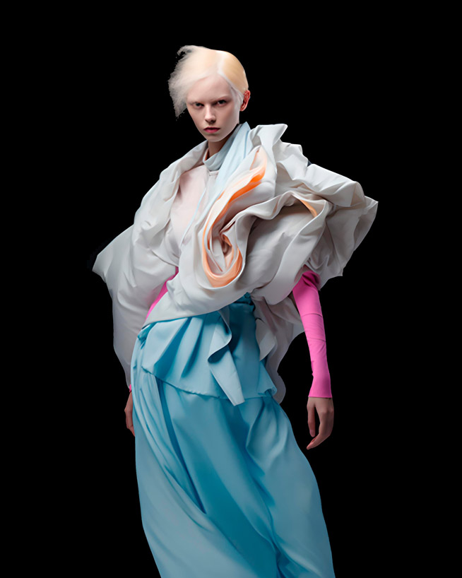 The starting point of creation of this collection are virtual volumes, applying the experimental pattern cutting method: Accidental Cutting, which is Eva Iszoro’s intellectual property and a distinctive element of the brand and its artistic activity. The images of the Accidental Cutting volumes are combined with specific texts into the prompts, that is, specific artificial intelligence commands. This ensures a unique and unrepeatable result. This is the brand´s seventh collection at London Fashion Week.