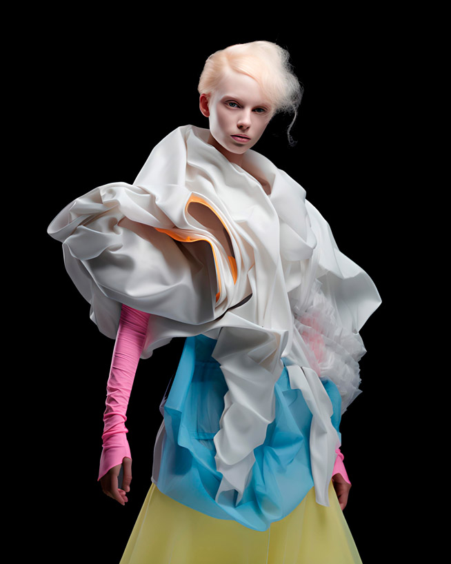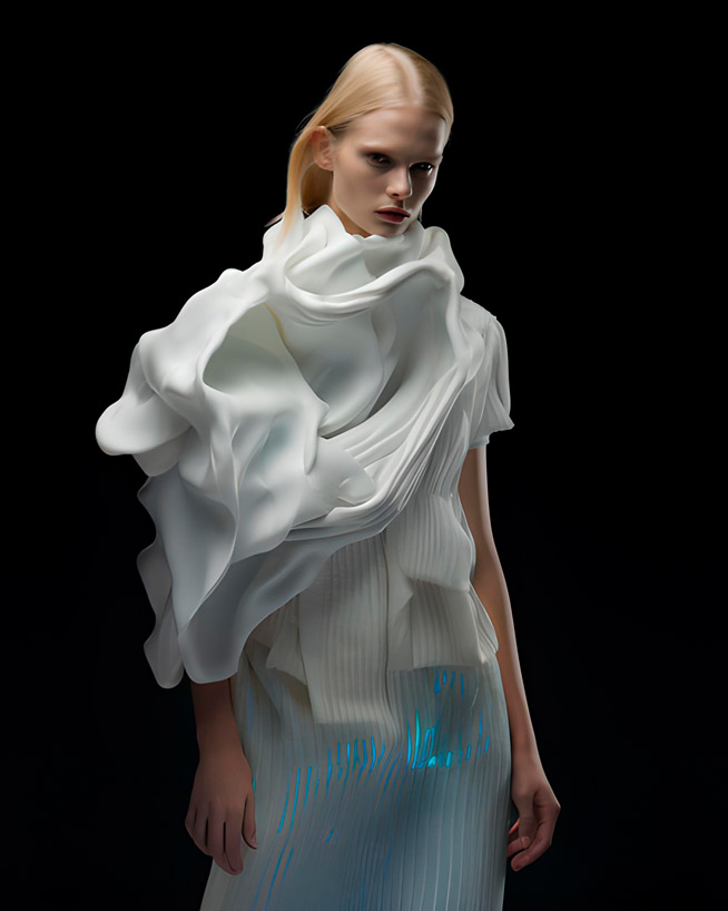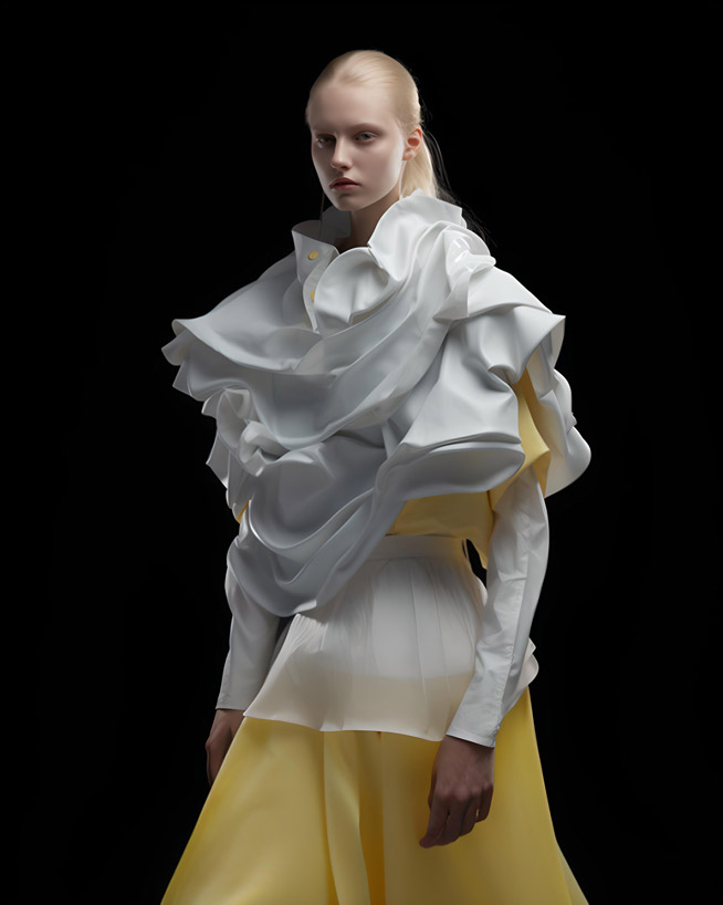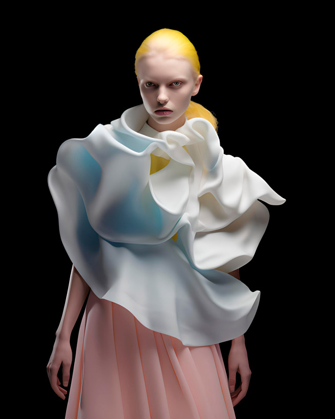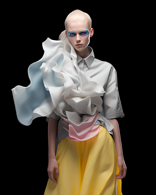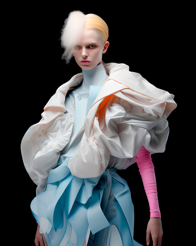 The starting point of creation of this collection are virtual volumes, applying the experimental pattern cutting method: Accidental Cutting, which is Eva Iszoro’s intellectual property and a distinctive element of the brand and its artistic activity. The images of the Accidental Cutting volumes are combined with specific texts into the prompts, that is, specific artificial intelligence commands. This ensures a unique and unrepeatable result. This is the brand´s seventh collection at London Fashion Week.