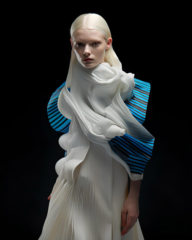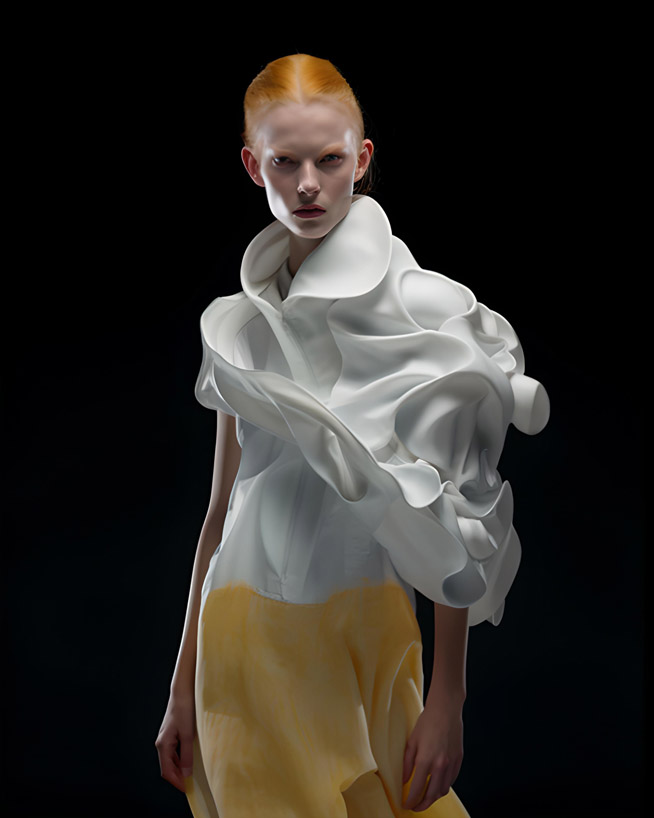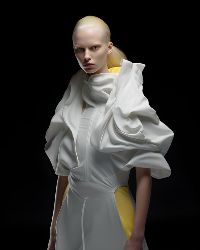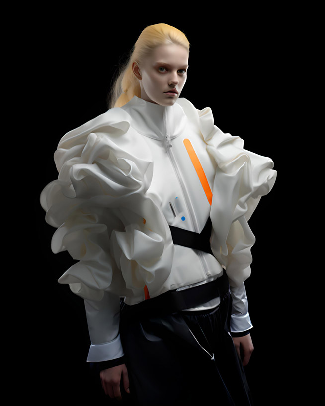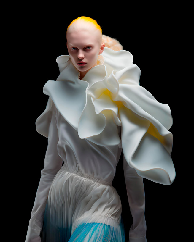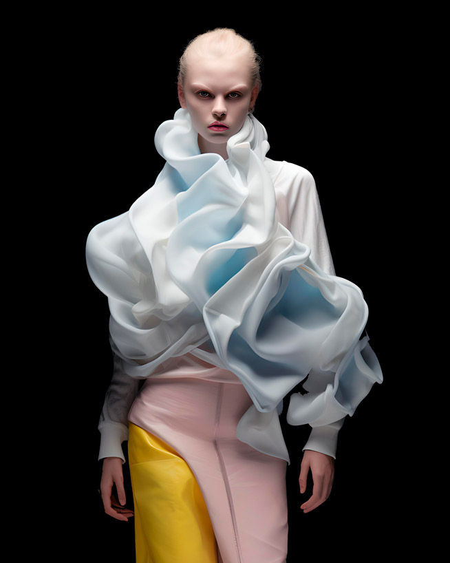 The starting point of creation of this collection are virtual volumes, applying the experimental pattern cutting method: Accidental Cutting, which is Eva Iszoro’s intellectual property and a distinctive element of the brand and its artistic activity. The images of the Accidental Cutting volumes are combined with specific texts into the prompts, that is, specific artificial intelligence commands. This ensures a unique and unrepeatable result. This is the brand´s seventh collection at London Fashion Week.