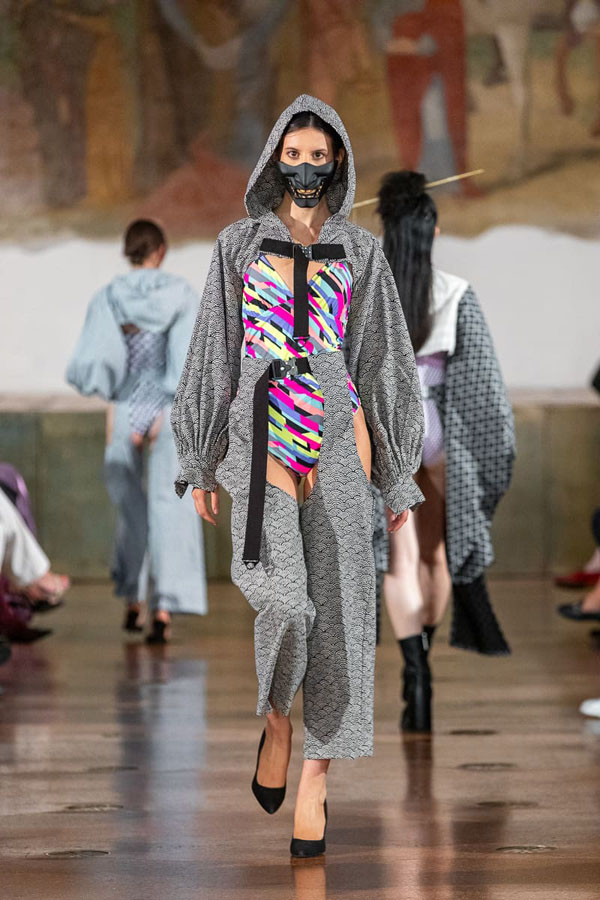 The three words are “ninja,” “oiran,” and “cyberpunk.” While there is no specific inspiration drawn directly from ninjas, some viewers may perceive a ninja-like essence when they see the models wearing masks. Regarding the oiran (courtesan), I incorporated a lot of “skin exposure,” which was a new challenge for me, as I usually do not create garments that reveal the body’s lines. It was unfortunate that the pants I designed, inspired by cyberpunk, were incorrectly labeled as “cowboy chaps” in another media outlet.