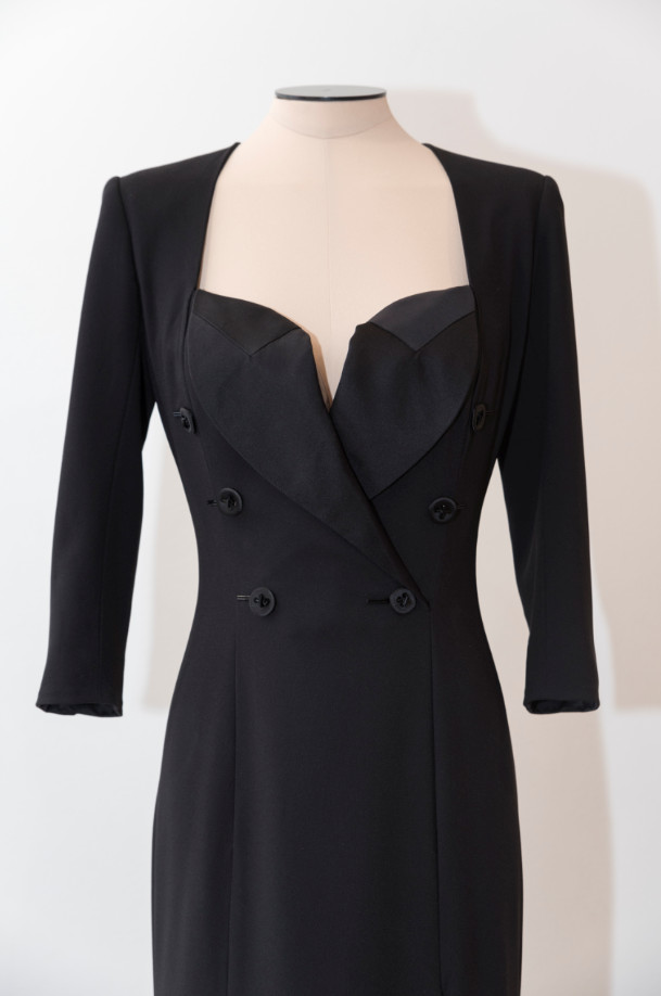 - Long smoking sheath in black crepe with a satin jacket-collar bustier, three-quarter sleeves and side slits.