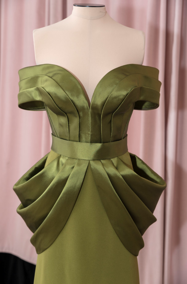 - Long bustier sheath in chartreuse crepe with draped and belted corset.