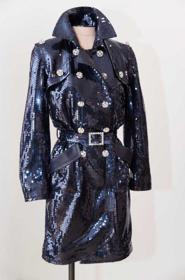 - Long midnight blue crepe sheath, embroidered in 3-tone cannetille goldwork arabesque patterns, with pagoda shoulders.