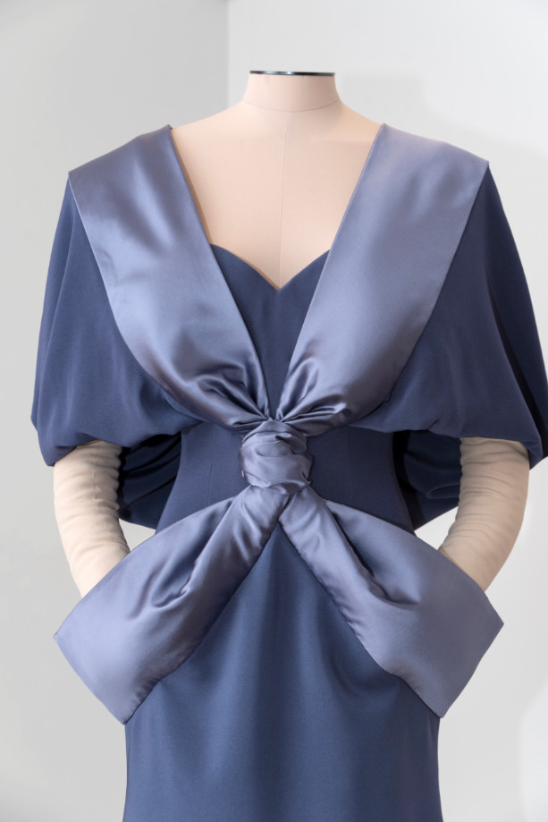 - Long hoodie sheath in periwinkle crepe, with a great draped bow-shaped hood in matching satin.