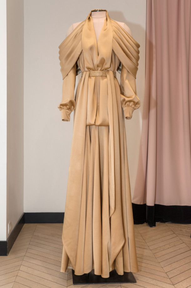 - Long negligé en gold princess crepe, with draped open shoulders and shirtsleeves.