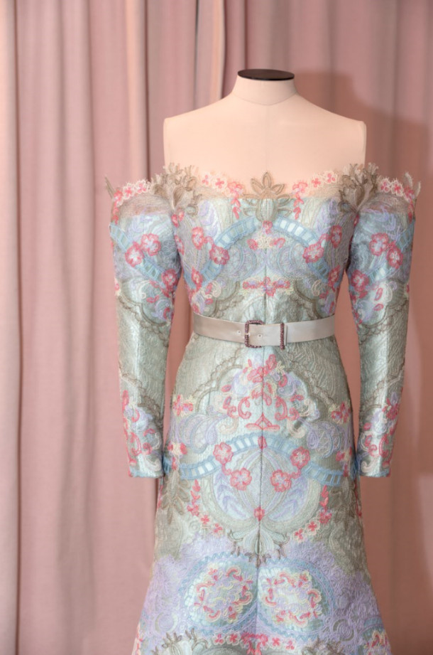 - Long boat-neck bustier dress with a wide A-line almond casimir floor-length skirt with multicoloured lace appliqué scattered with rocaille bead flowers. Satin belt.