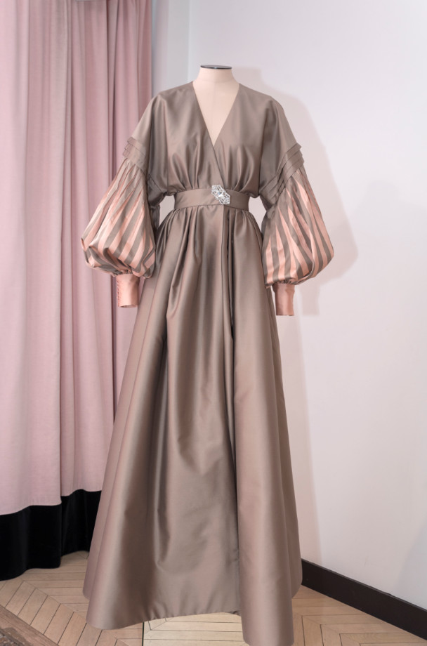 - Great wrap dress gown in light clay silk toile, with blind-tucked shoulders and generous pleated striped sleeves in clay and pink. Belt with brooch.