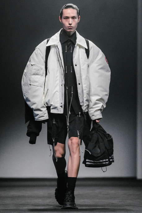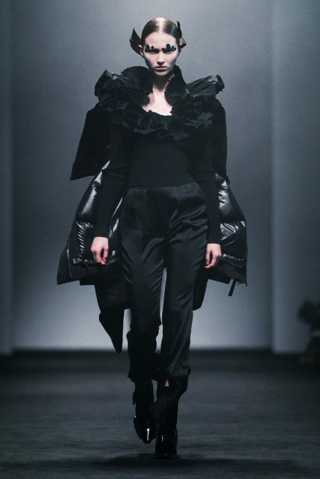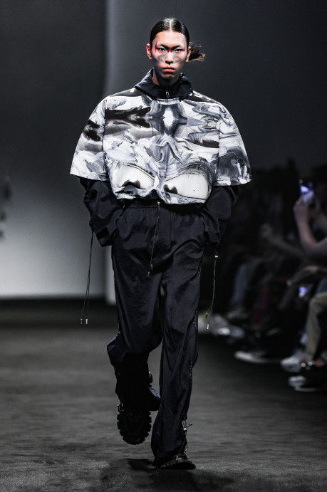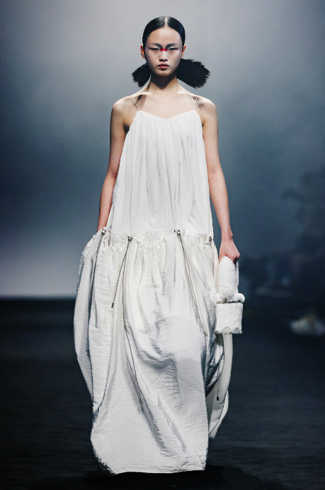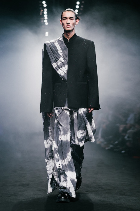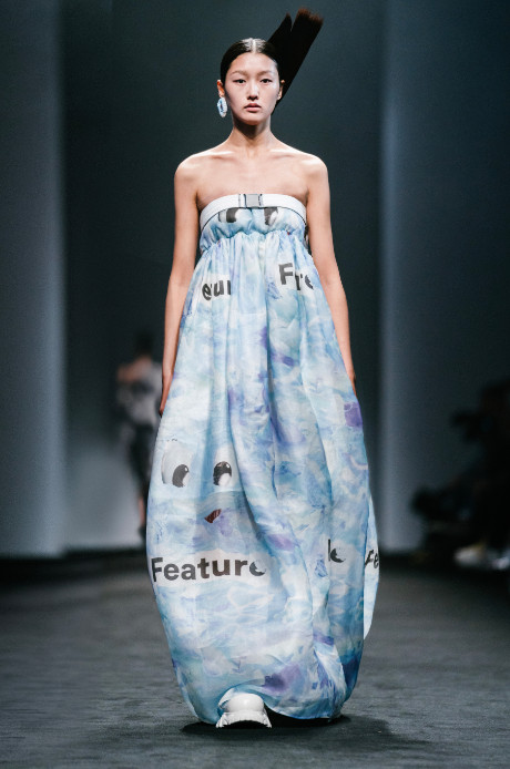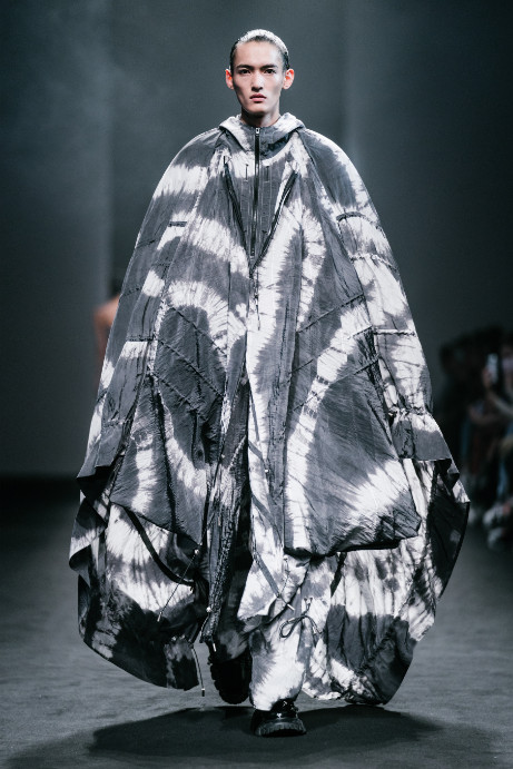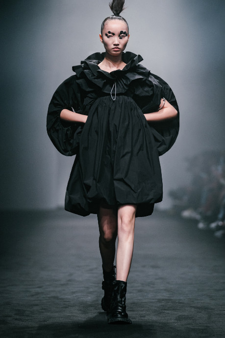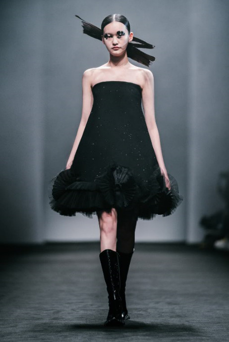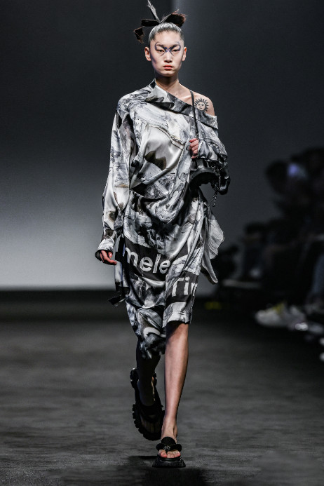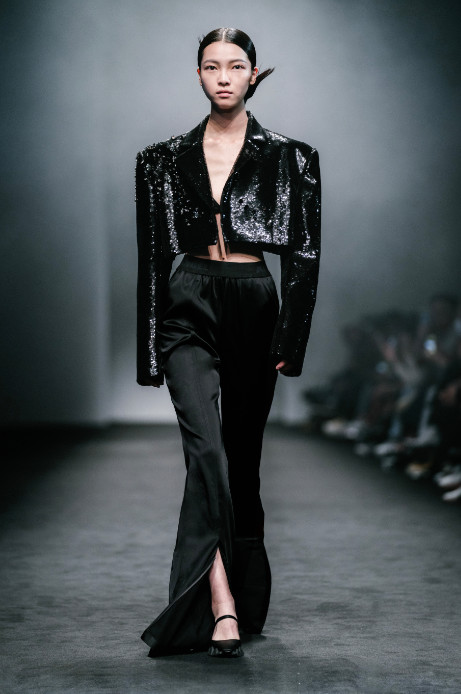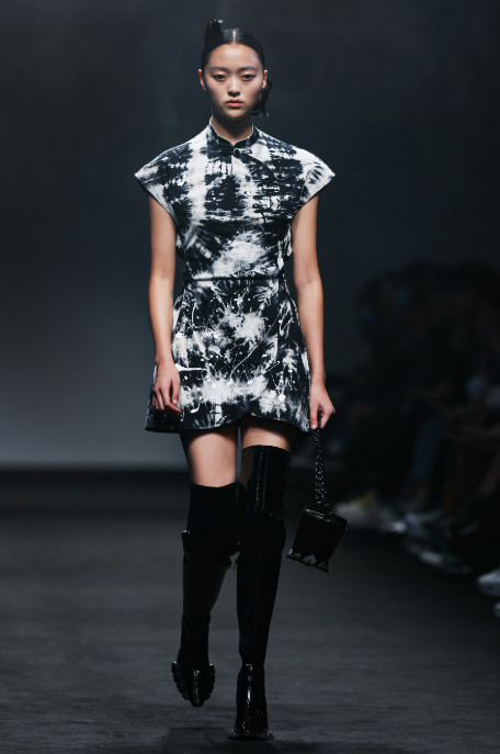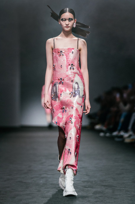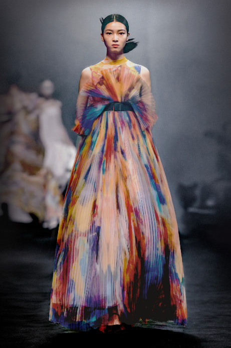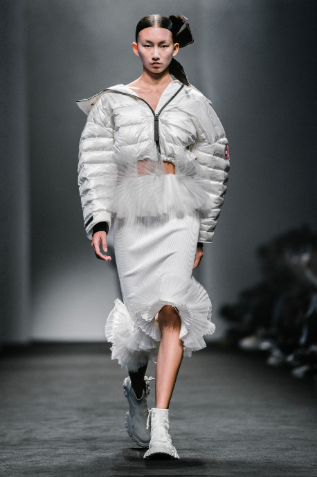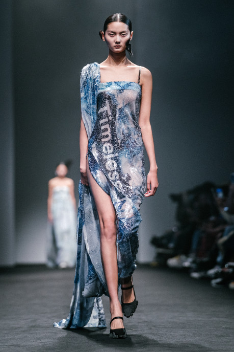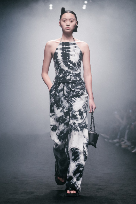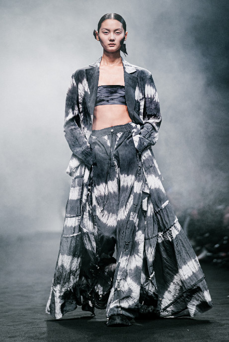 The result is an impactful collection strong in vitality and sentiment. Chen’s signature styles find stamina against Jiajia’s works in print by adding a cover of transparent sequins, and her choice of carefully sprinkled upcycled Swarovski crystals, to further spotlight colour strokes. Angel’s maturity is evidenced by the contrast between the playfulness of tie-dye in colours that mirror Wang’s art and hinting at her time in Netflix’s Next in Fashion, against a debut series of evening looks made out of black sequined separates and colour-neutral dresses smartly styled with her Canada Goose collaboration pieces.