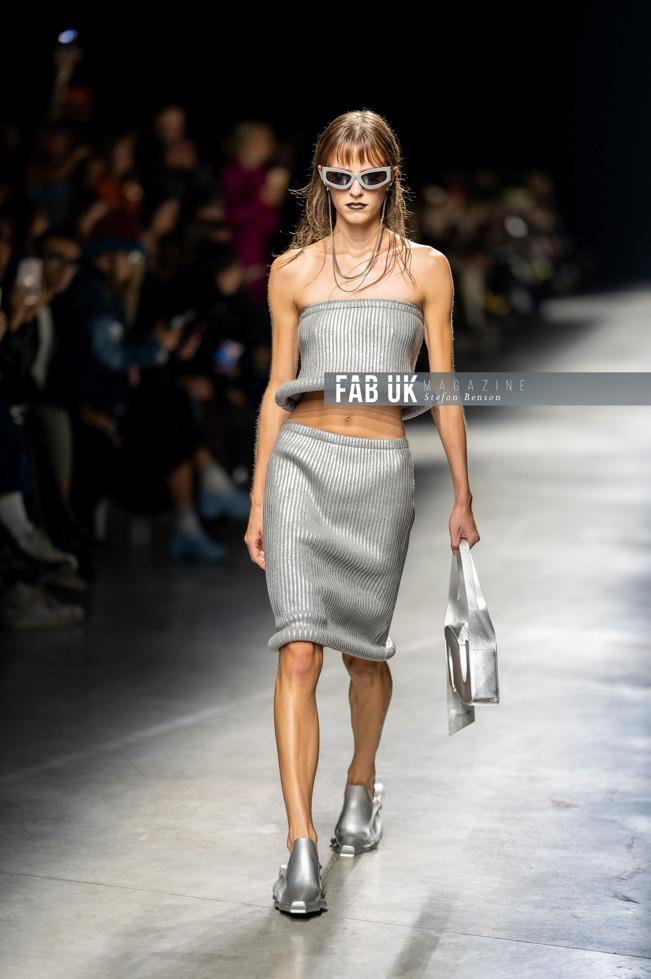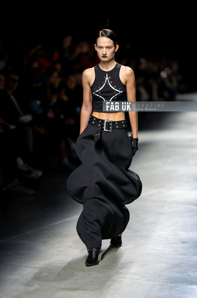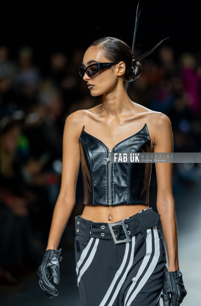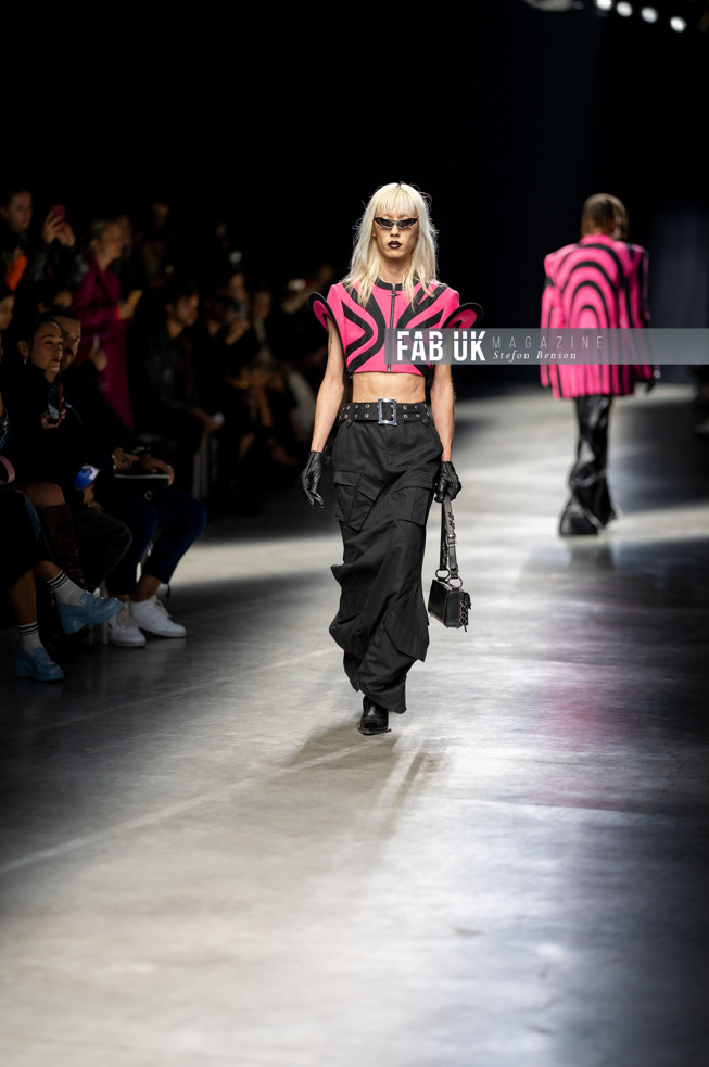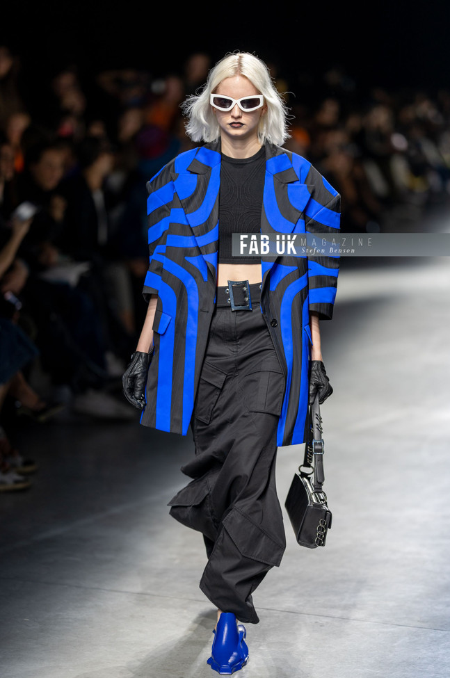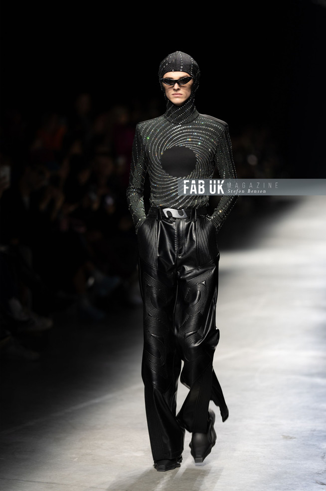 Circular buckles and studs add a futuristic punk touch, while the mix of materials and typical details of the brand transform the clothes unexpectedly. Further-on the special treatment applied to denim breaks the traditional monotony; tops, trousers, and bra tops are characterized continuously by the theme of fractal art.