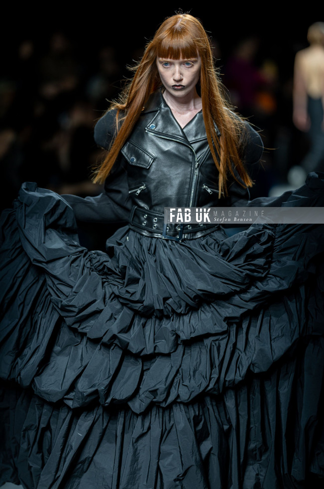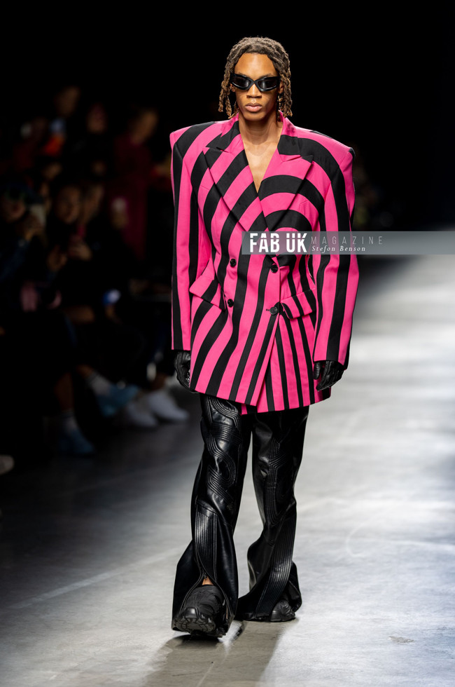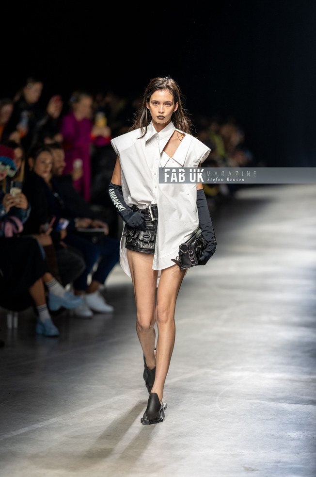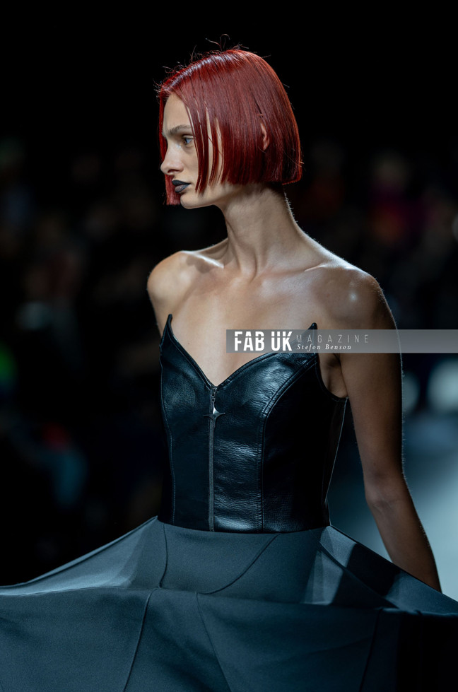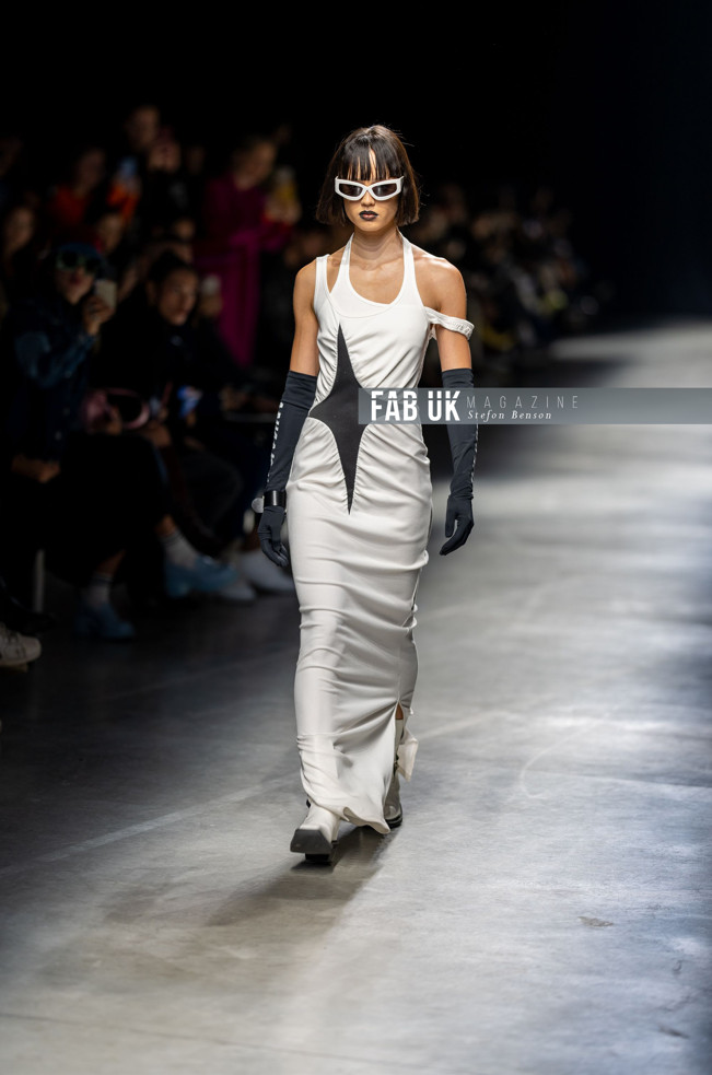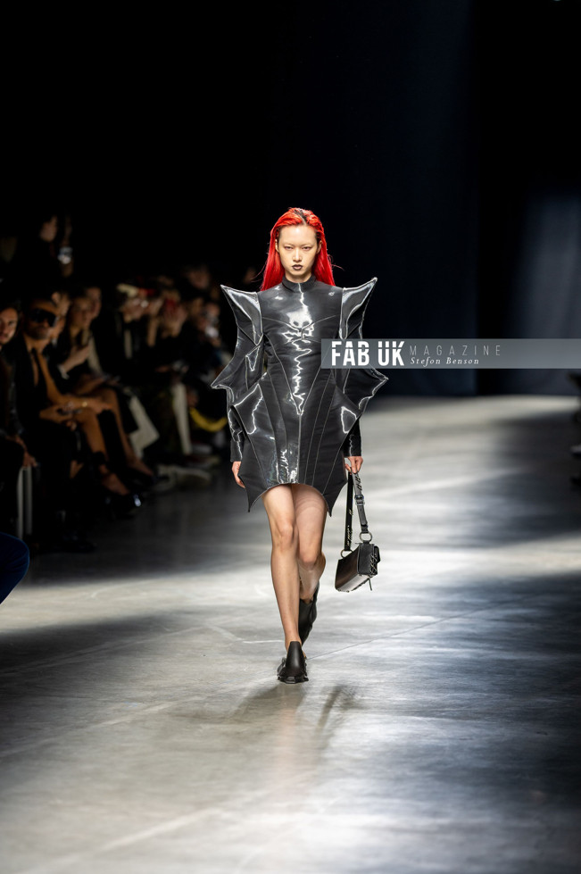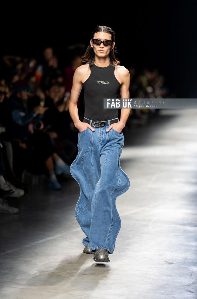 Circular buckles and studs add a futuristic punk touch, while the mix of materials and typical details of the brand transform the clothes unexpectedly. Further-on the special treatment applied to denim breaks the traditional monotony; tops, trousers, and bra tops are characterized continuously by the theme of fractal art.