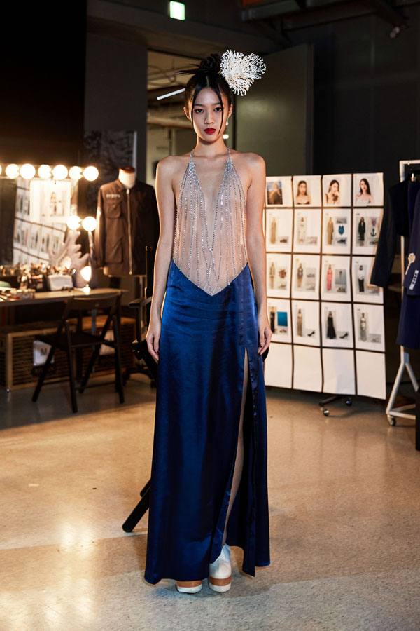 Continuing APUJAN’s signature storytelling approach, the AW25 collection integrates traditional Eastern garment elements with modern Western silhouettes. The color palette, dominated by blue, pink, green, and black, evokes the mysterious depths of the ocean, enhanced by prints and fabrics resembling ripples and underwater elements.
