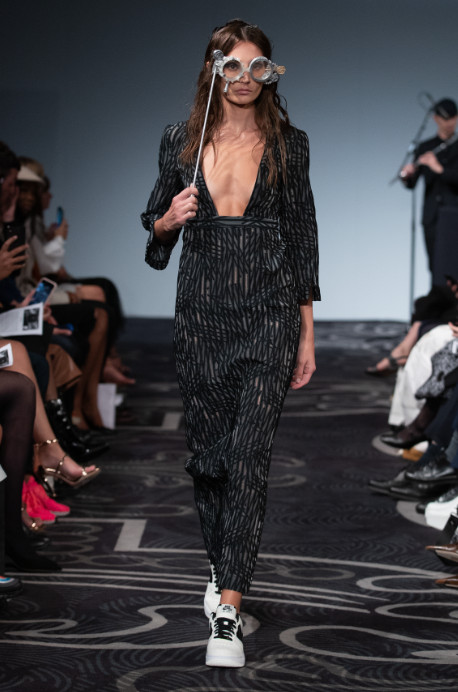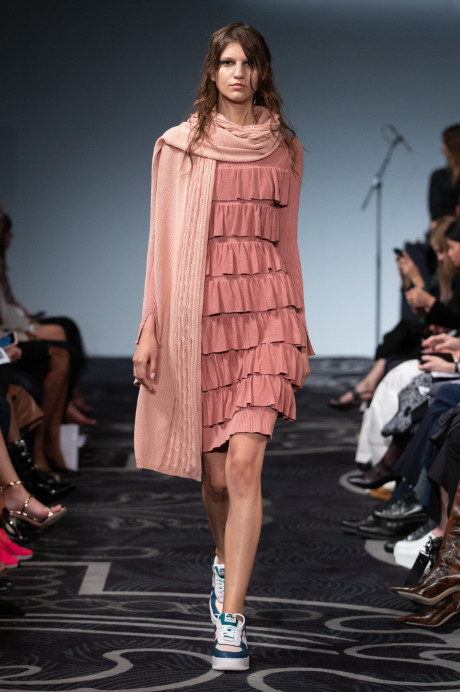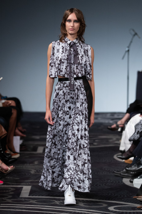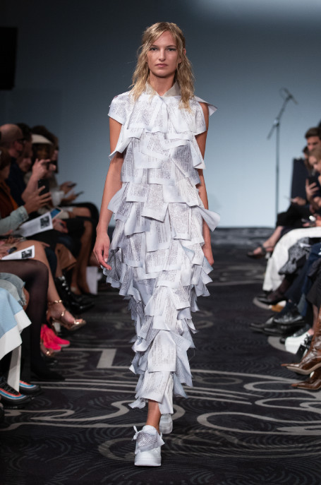 APUJAN is using this collection to tell his own story, a science fiction fantasy involving time lapses. It features time thieves, stolen time, time observers, interweaving timelines, time movement, and confused time, within both retro and sci-fi settings. In his collection, we can see flowers blossoming and dying, deadwood, dinosaur bones, stars and clocks, all of which symbolise the flow of time. Looking at the designs, we can see colour blocks, lines and staggered weaves, alongside re-constructed design pieces and skewed necklines, all of which reflect the disruption wreaked by time. The hairstyles of the models have been designed to conjure images of a time vortex. Continuing on from his previous seasons, APUJAN leads us into his fantasy world, with subsequent pieces opening new chapters and volumes in one seamless tale. Choices of packaging and tags also reinforce this impression, even the dresses feature book pages and stories to further complete the imaginative narrative.