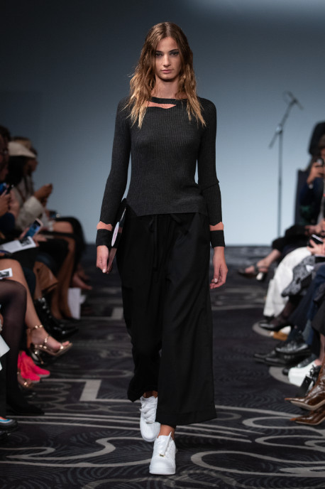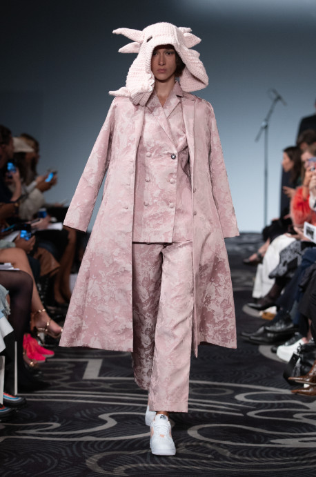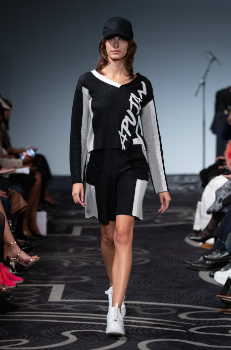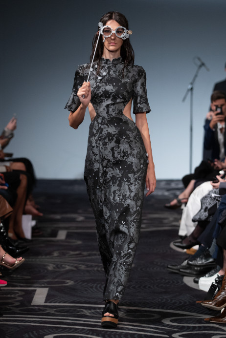 This Spring/Summer collection contains over 100 individual pieces. APUJAN showed 33 outfits on the runway, featuring headwear, scarves, knitwear, evening gowns and read to wear. The overarching theme continues in the brand’s signature style, featuring oriental details and western contours, with additional elements that draw on the traditions of fantasy and imagination. This season, the cheongsam buckle, oriental collar and sleeve style can be found in different garments such as shirts, coats, dresses and gowns, as well as the traditional festive headwear. The accessories that can be seen on the runway include 100% cashmere scarves, hand-woven woollen hats, floral headwear and 3-D printed glasses. The sporting theme, which was the focus of last season’s collection, can also be seen in several of this season’s pieces.