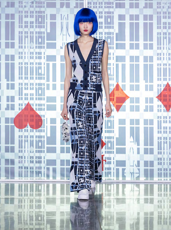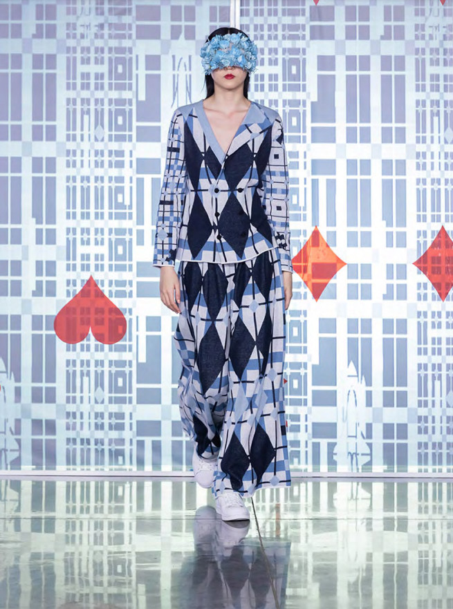 Unique distinctive details as per the large playing cards, rhombus, spaceships, planets, keys, puzzles, chess, and dinosaur heads are showcased all over dresses, coats, shirts, suits, cardigans, and knitted pants.