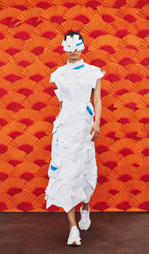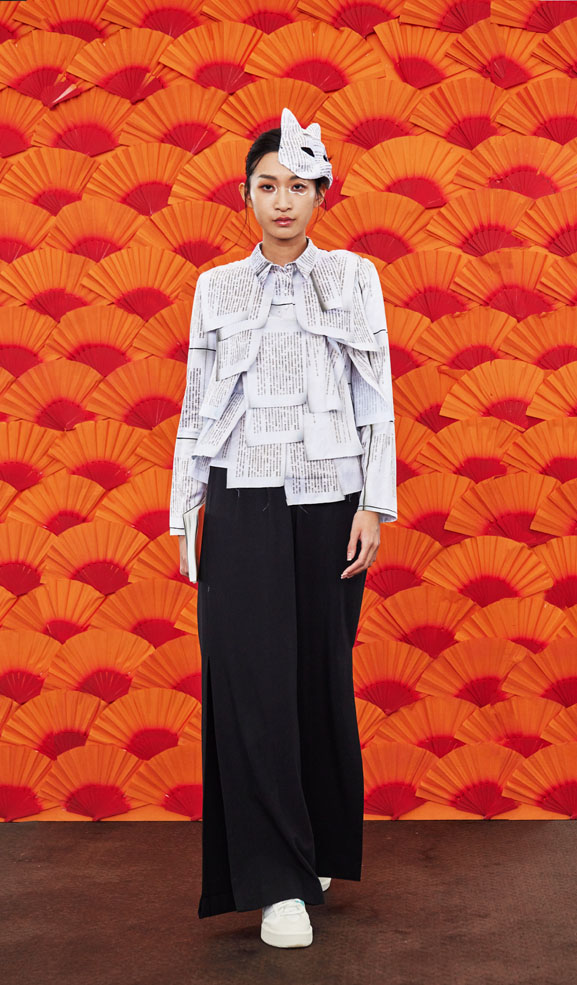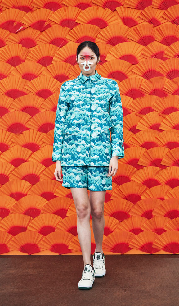 The collection will feature symbols from the novel such as the monkey insignia referencing the character of the phantom thief, the stolen peach, white horses and other plot elements whilst also referencing the landscape. The trees, clouds and cities in the clouds take the senses through the perspective of the reader as they travel the sky and fantastical world depicted in varied aspects of the clothing. The narrative of the show is told through prints and jacquard patterns, tying together the mystery and fantasy of the sky with referential plot elements.