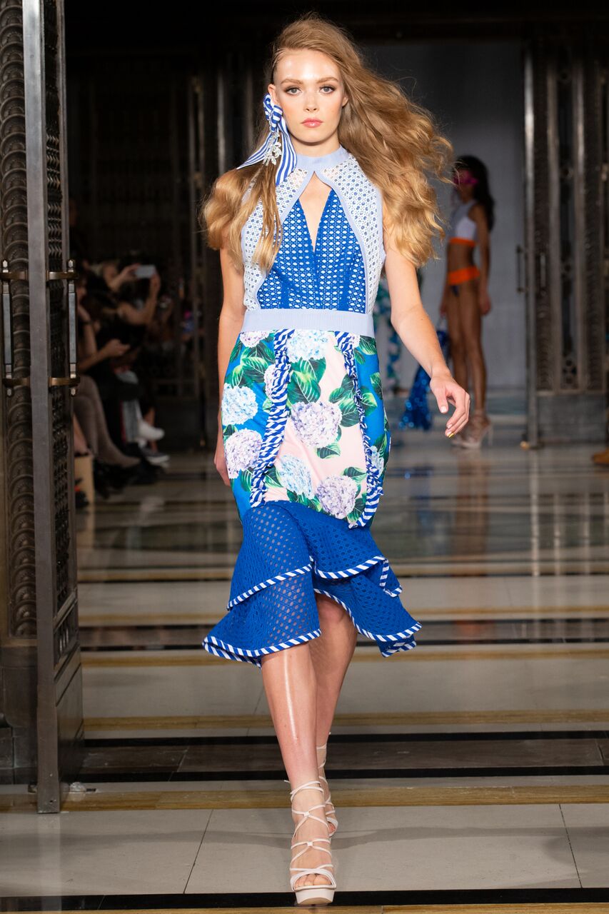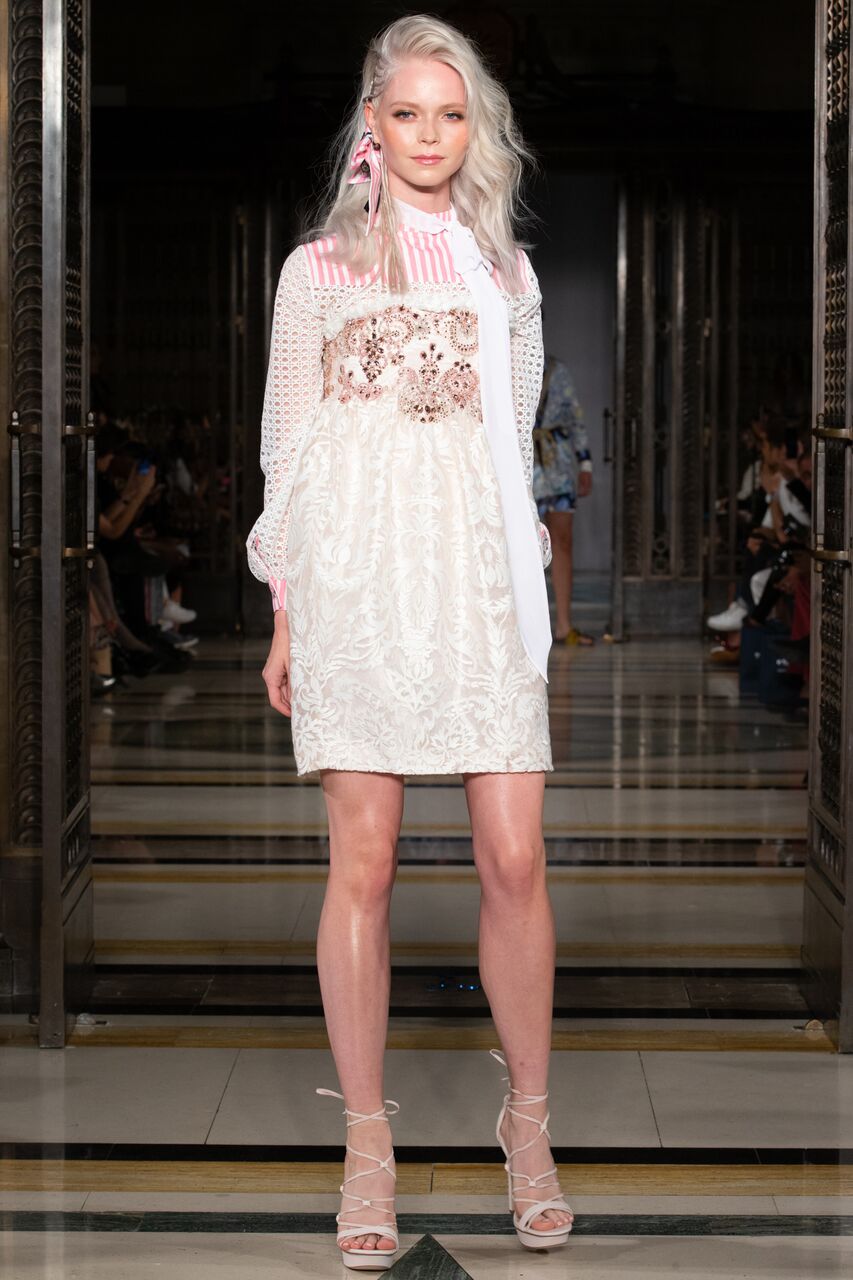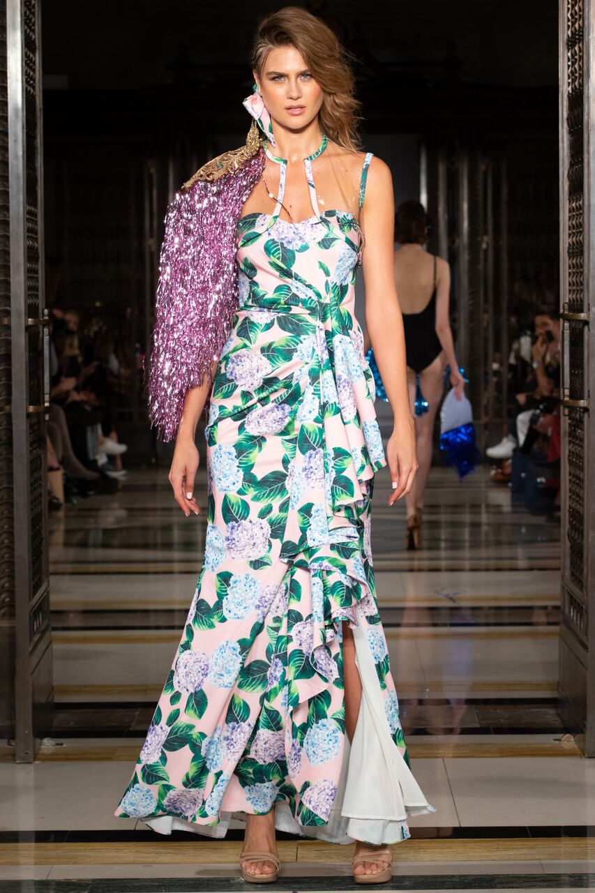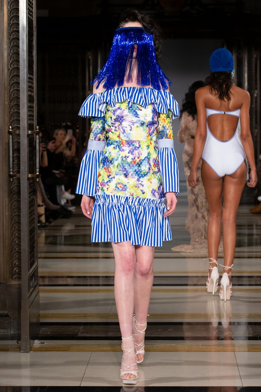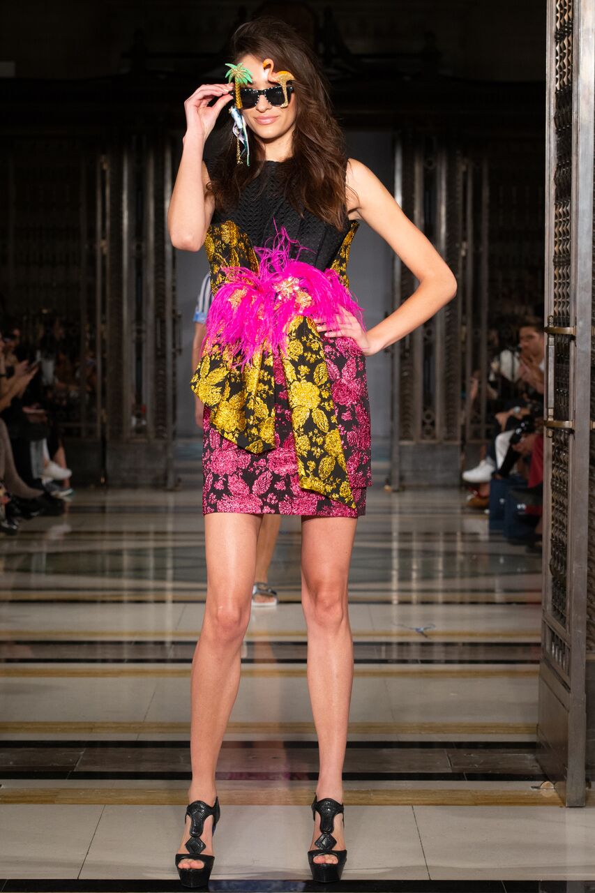 Sequins and glitter reign supreme throughout this star-studded collection fit for a magpie eye. Expect embossed twinkling brocade and bold blooms with towering hydrangeas that set a sweet undertone to these voluminous pieces. Metallic fringing dances across the disco floor with his seventies inspired evening wear. Waistlines are accentuated by trophy coloured Westworld belts, adorned in stars serving sartorial sass. Block-coloured broderie anglaise are the perennial staples in primary colours as the base to any Ashley Isham fan’s wardrobe. Unabashed elegance and hyper-femininity is the foundation to this night fever redemption.