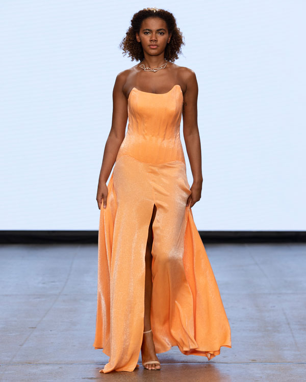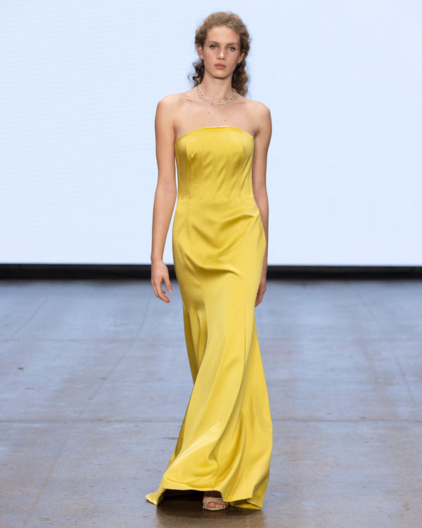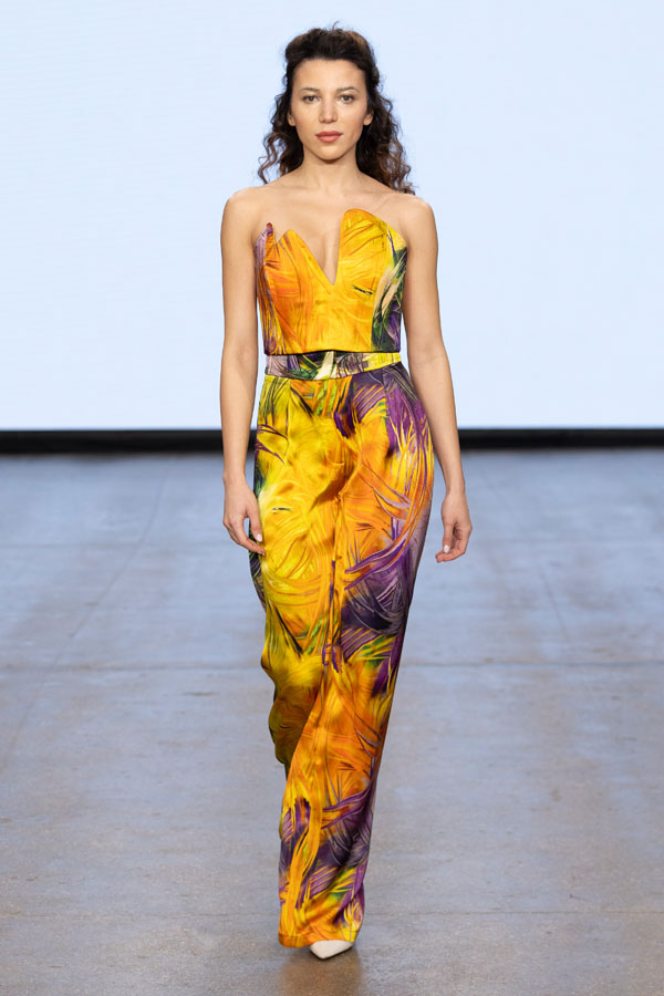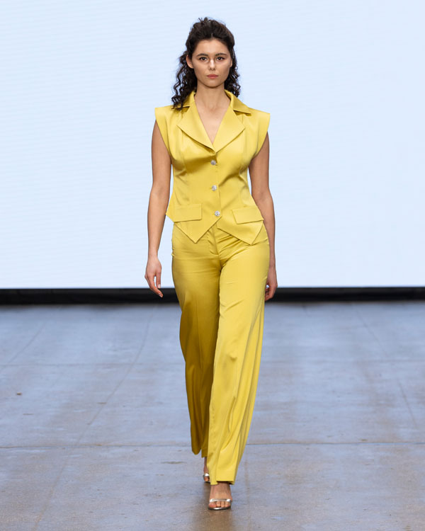 Guests at the runway show witnessed a striking blend of structured column gowns, corseted waistlines, and asymmetrical one-shoulder drapes. Goddess-like silhouettes, textured marble-effect prints, and architectural pleating paid tribute to ancient craftsmanship, while flowing chiffon and layered tulle softened the aesthetic. The color palette—soft greens, golden yellows, twilight lilacs, and ivory—mirrored the natural beauty of Ephesus at dawn and dusk.