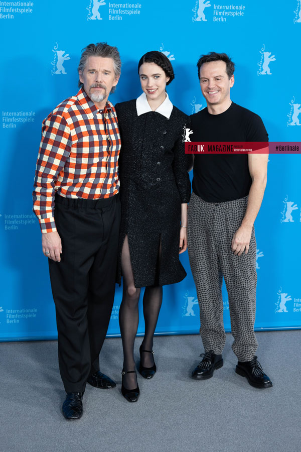US actor Ethan Hawke, US actress Margaret Qualley and and Irish actor Andrew Scott pose during a photo call for the film ‘Blue Moon’ at the 75th Berlin International Film Festival (Berlinale), in Berlin on February 18, 2025. (Photo by Victoria Mazurova/FABUK)