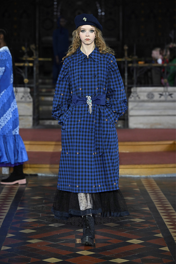 A key detail of the collection, Aksu takes direct inspiration from the most famous portrait of de Pizan herself. The painting depicts the author deep in thought at her writing table accompanied by her beloved dog and wearing a flowing gown of deepest blue. This blue is a thread running throughout the entire collection, tying together the taffeta gowns, cropped jackets and bringing the voluminous and rich Renaissance style to life in the 21st Century. De Pizan’s dog appears as a motif through the collection, adding a touch of unadulterated joy to the whole affair and building on the humour that Aksu seeks to include in all of his collections.