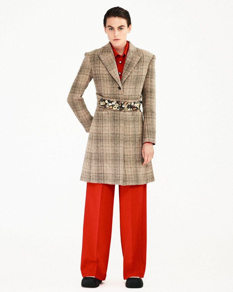 The simple tweed color block jackets and coats are decorated with antique buttons on the collar, waist and pockets, giving them a vintage and sophisticated look; the simple solid shirts are embellished with mesh beading on the chest, adding a touch of fun; the minimal shoulder bag, sporting the signature CALVINLUO metal square clasp, provides a sense of order to the maximal candy-colored accessories. Minimalism and maximalism are never complete opposites, but rather a set of aesthetic orientations that transform each other in terms of creativity.
