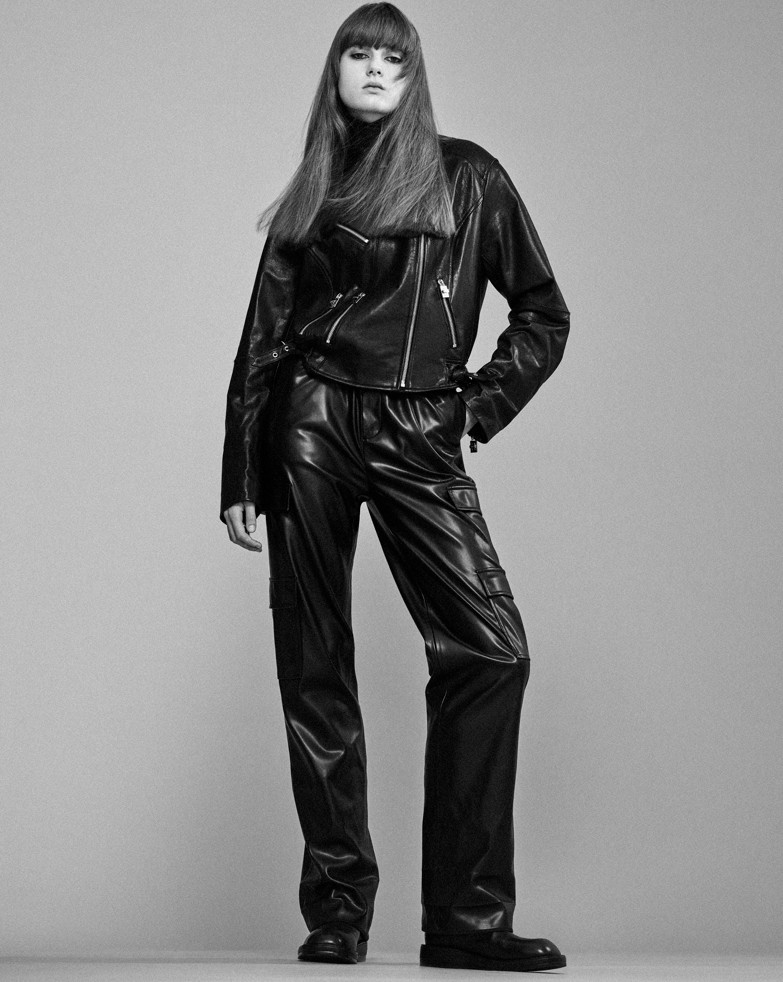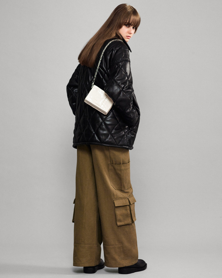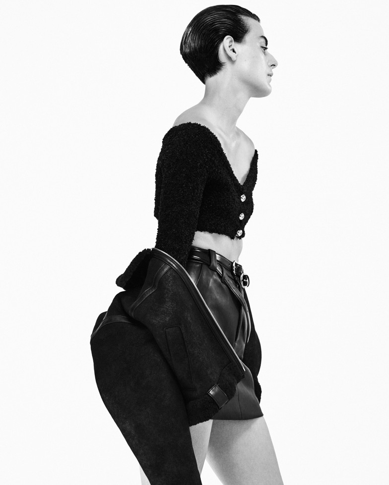 Calvin places the iconic CALVINLUO square metal lock hardware next to novel globular, science fiction inspired, metal buttons. Adorning cardigans, blazers and quilted leather jackets, or independently in the form of belts and collars, the new glittering, ball shaped buttons add a futuristic and surreal touch to CALVINLUO’s classics.