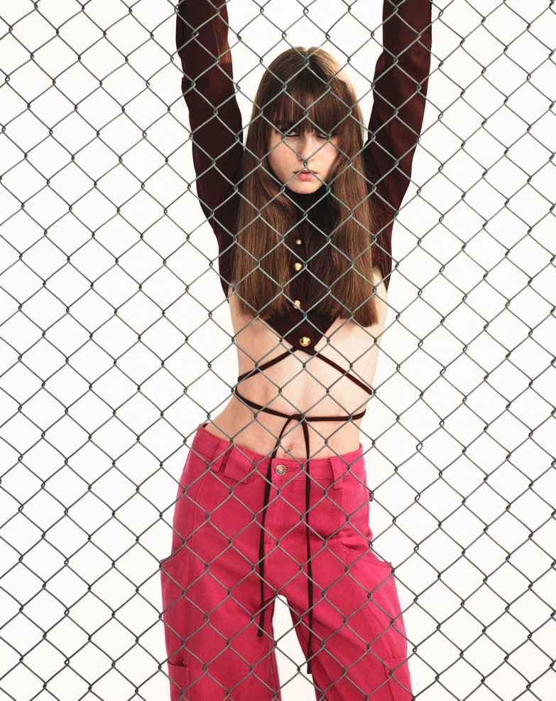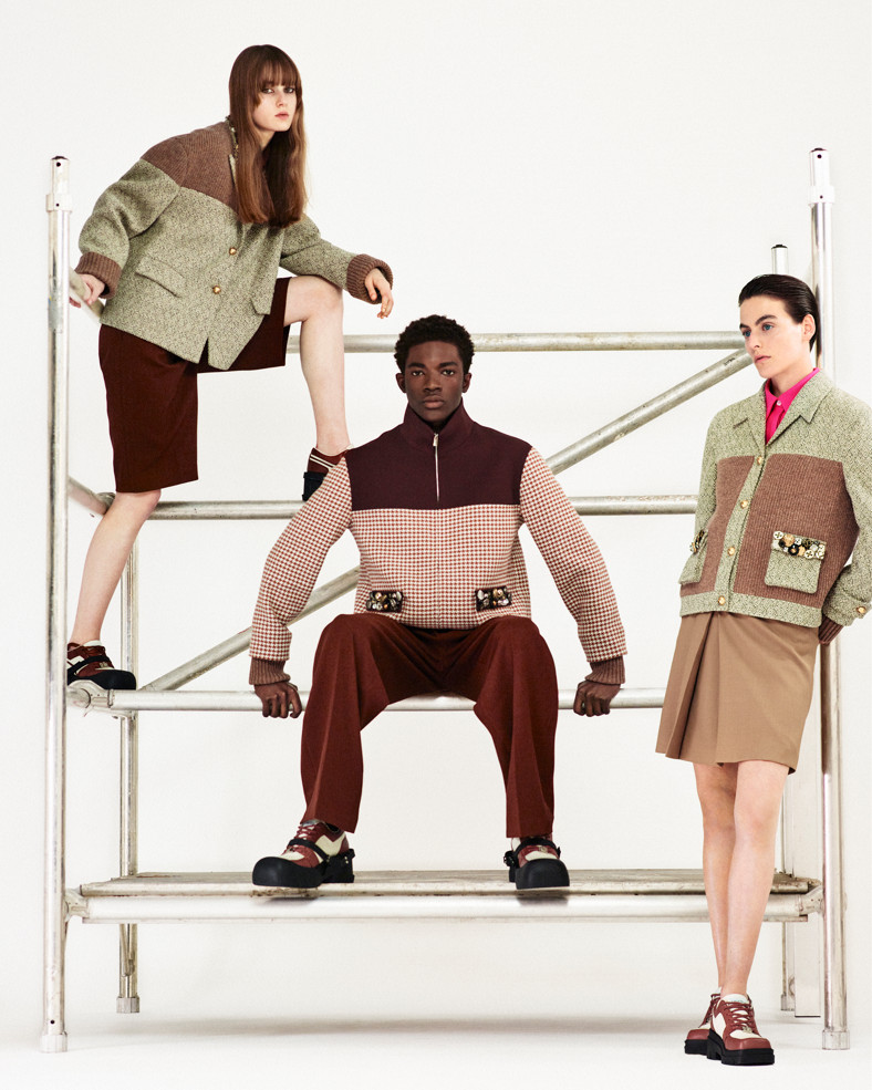 Blazers with sharp lines meld with new tailoring and proportions, fusing lines of sportswear and high street wear to present a pioneering silhouette; pseudo two-piece blazer features unique cut exterior and fitted waist interior; cropped classic blazer enjoys paneled design of a short baseball jersey; street-style utility miniskirts and patch pocket low-waisted pants are paired with classic cropped blazers; leather shoes and sneakers are deconstructed and recombined – classic designs with novel surprises.