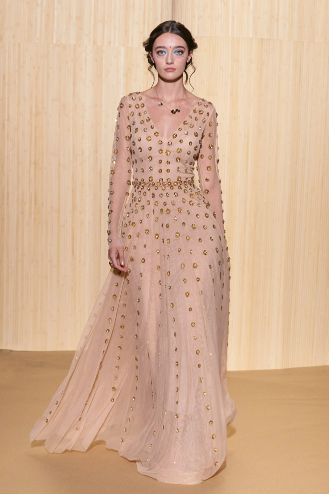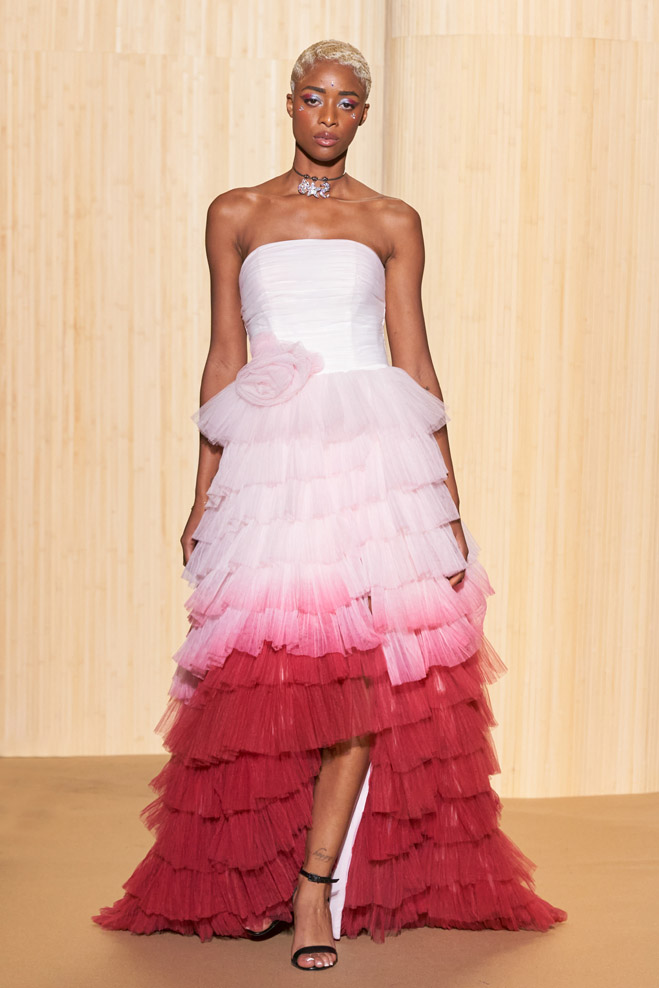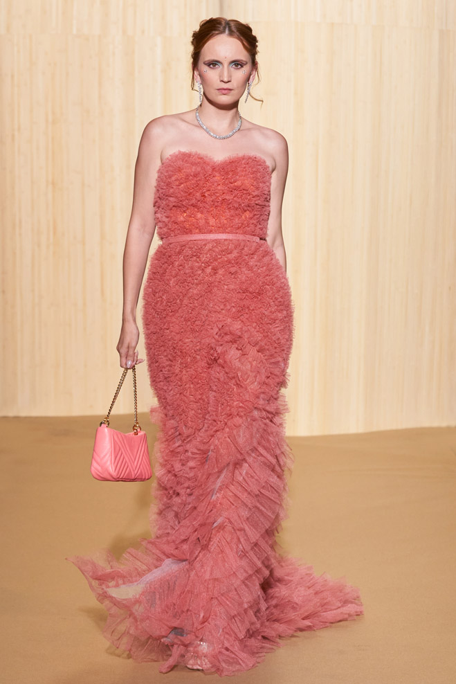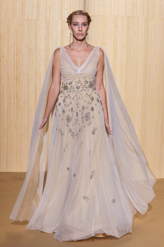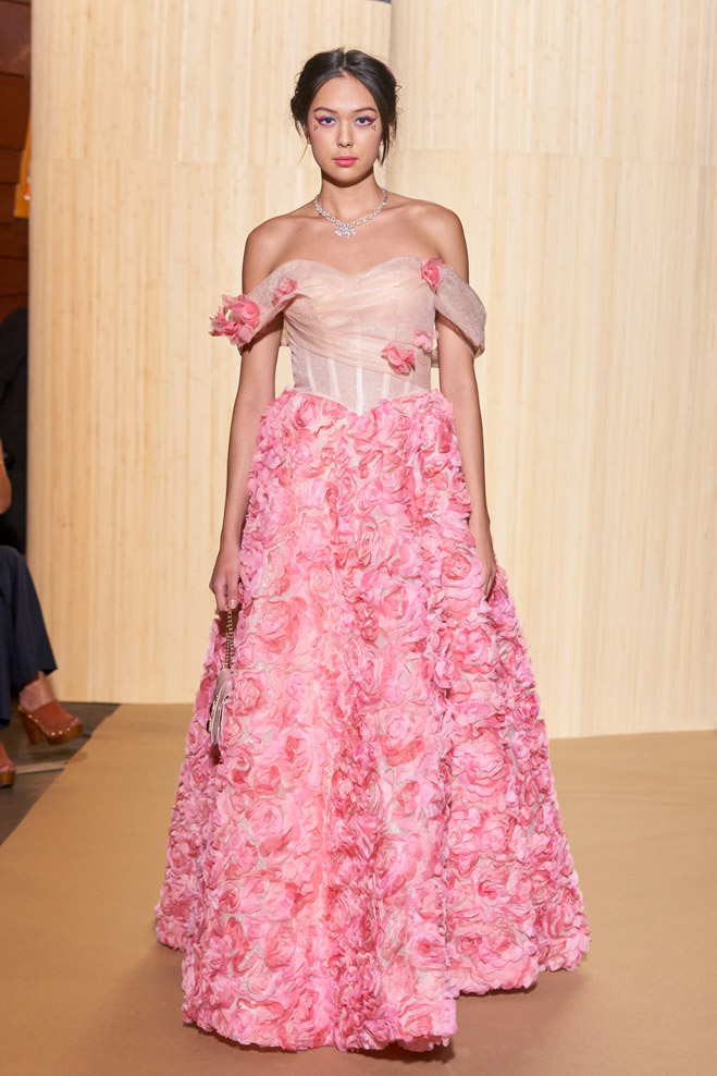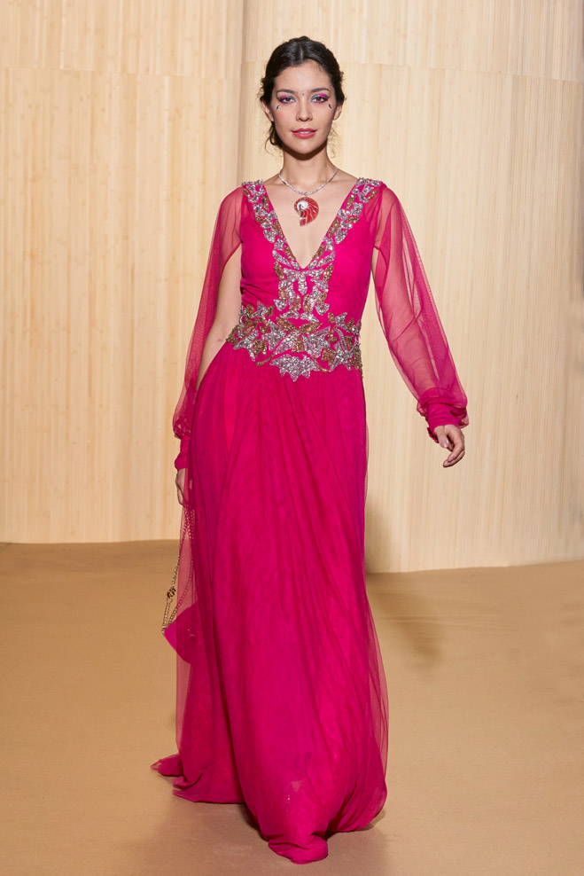 For his Spring-Summer 2024 collection, French designer Christophe Guillarmé was inspired by the Indian Lotus flower goddess Lakshmi and Bollywood imagery. Glamor with unbridled happiness and iconic choreography from Aishwarya to Deepika. The 3D flowershaped drapes recall the art of the Sari and its ancestral tradition.