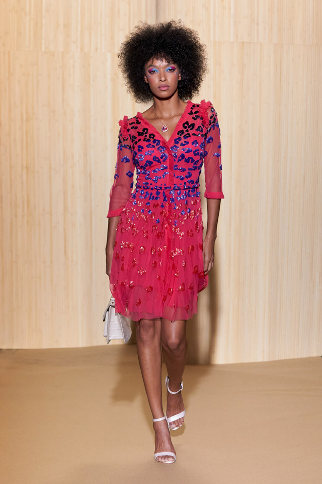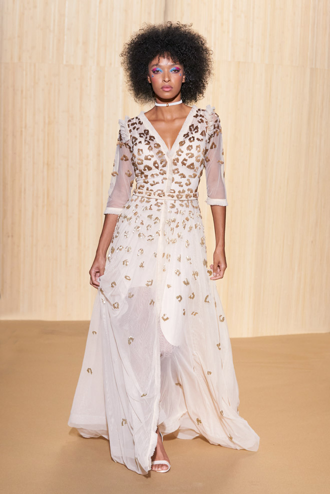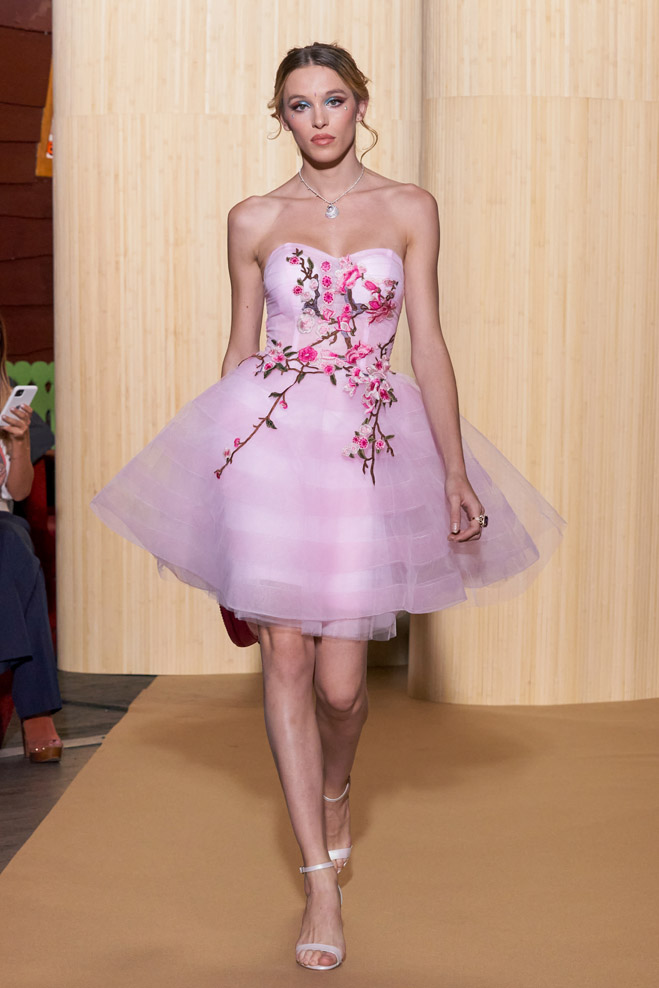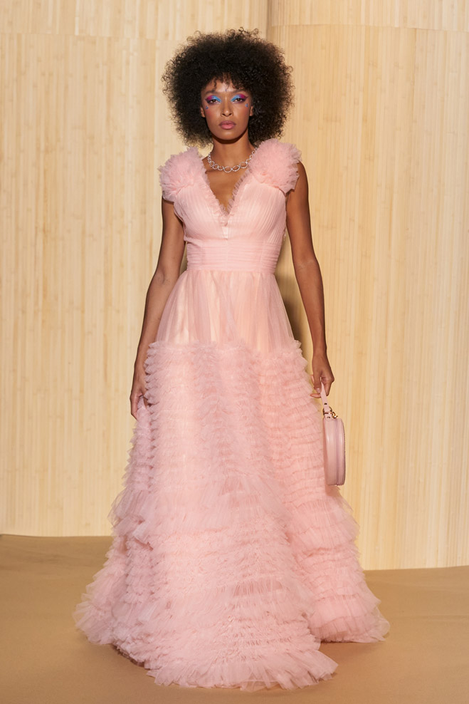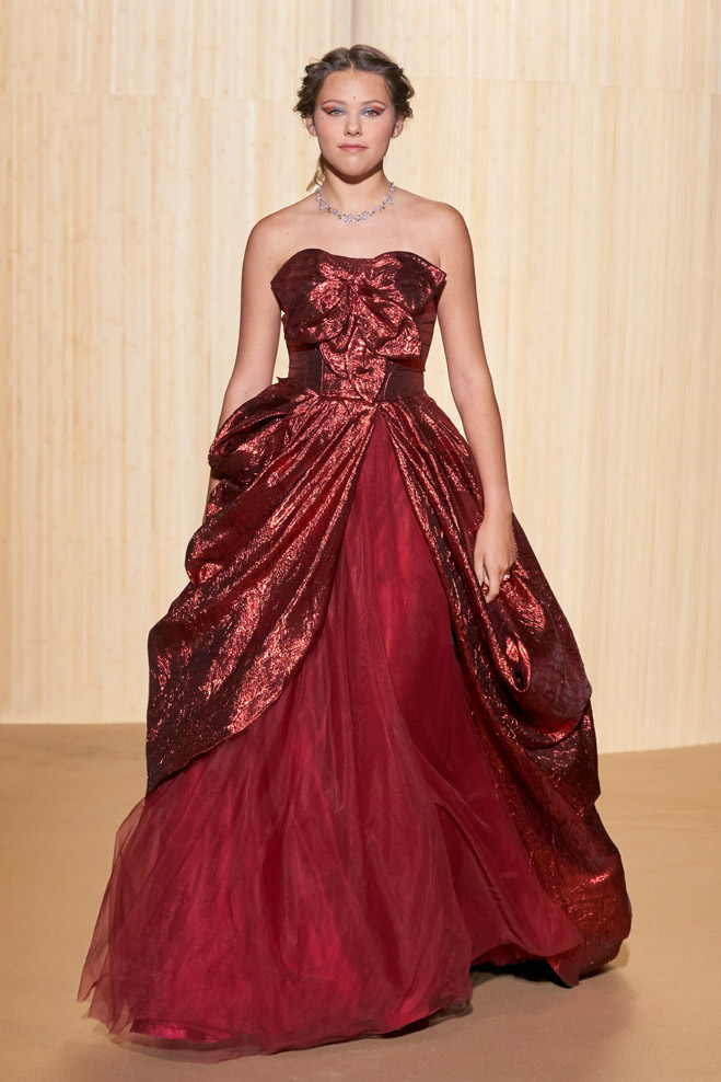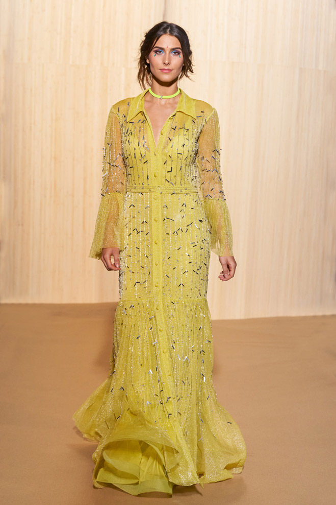 For his Spring-Summer 2024 collection, French designer Christophe Guillarmé was inspired by the Indian Lotus flower goddess Lakshmi and Bollywood imagery. Glamor with unbridled happiness and iconic choreography from Aishwarya to Deepika. The 3D flowershaped drapes recall the art of the Sari and its ancestral tradition.
