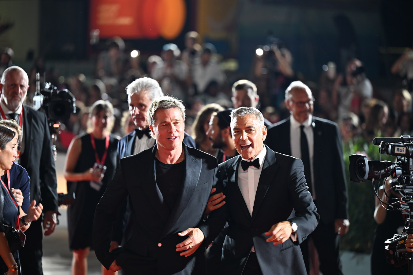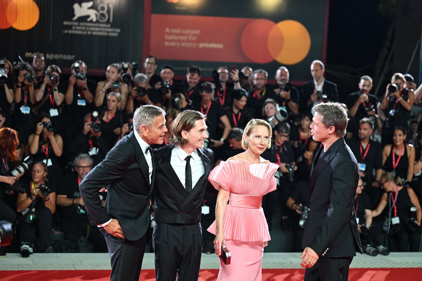 Picture this: Clooney, exuding gentlemanly elegance, and Pitt, flashing his signature laid-back grin. From the moment they arrived, it was clear that fun was going to be the evening’s main event. They even broke into an impromptu dance on the red carpet, laughing and sharing knowing glances like two old friends reuniting after years apart. The stroke of genius? Without hesitation, they joined the photographers, posing alongside them as if they were tourists on holiday, casually enjoying the glamour of the night.