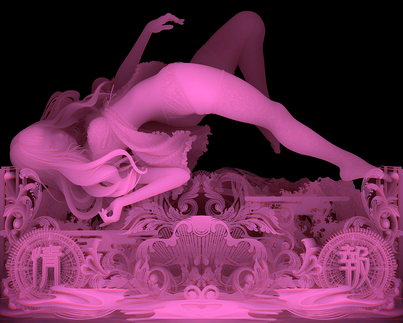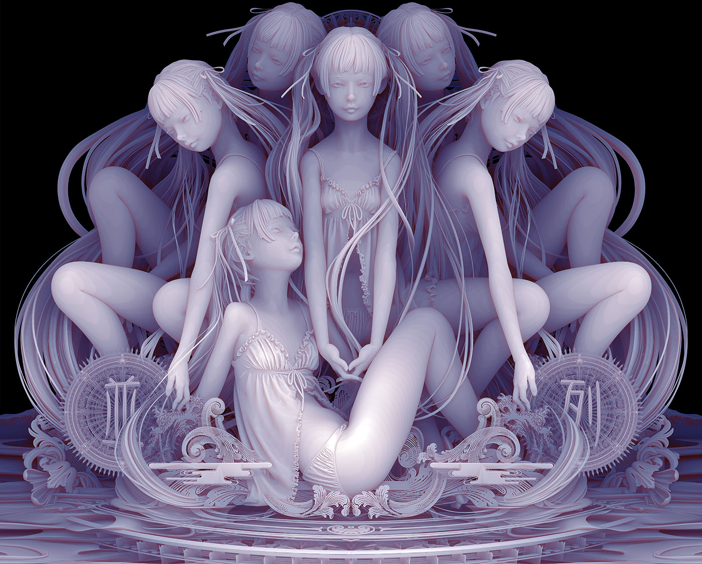 To create his beautiful pieces, Takamatsu uses a technique known as “depth-mapping” while also getting inspiration for his subjects from the classic Japanese manga girls. Depth-mapping is a mixed media technique that consists of the combination of classical drawing, airbrush, graphics and gouache hand painting. This process makes it so that every single pixel appears as a specific shade of grey which is proportional to the distance the viewer sees it from. Thanks to this technique Takamatsu is able to give his work an incredible amount of depth and surrealism. His monochromatic Lolitas are born in a study and they are then shaped through infinite shades and tones of whites and greys, to emerge from an abysmal depth into the breathtaking compositions that are Takamatsu’s final pieces.