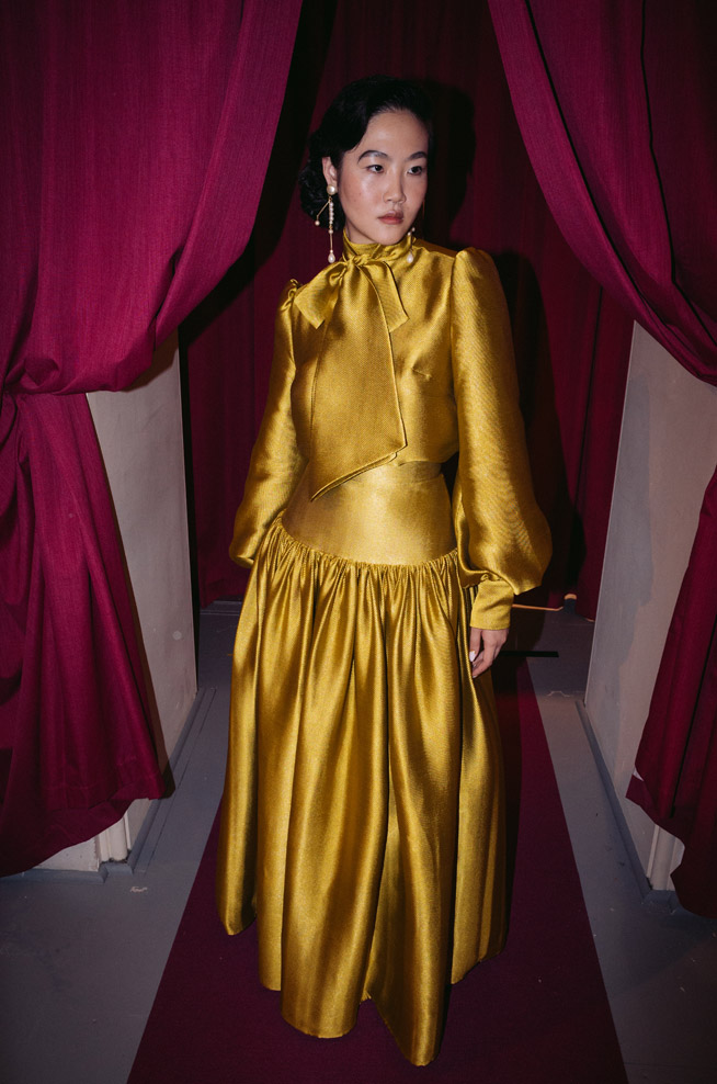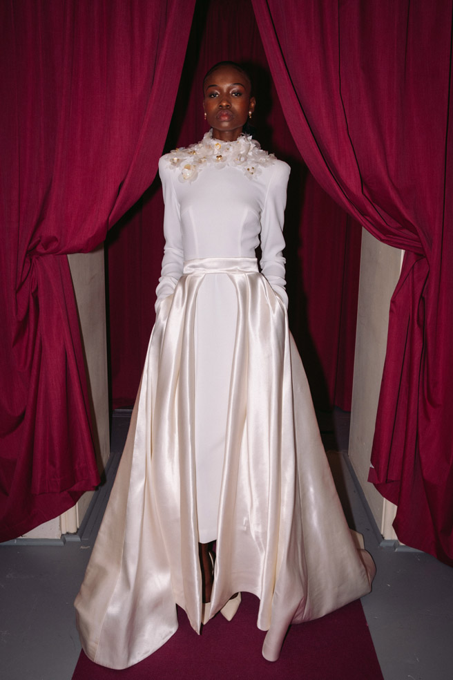 One such prominent statement is the new fan cape, which we see in a burnt orange silk taffeta teamed with a matching long pencil skirt in an ivory silk canvas, which really allows the form to shine. These colours complement a vibrant palette of acid yellow, noir and fuchsia. For the first time SABIRAH delves into luscious embellishment: laser- and hand-cut petals with crystals and hand beading are sprinkled throughout the collection, adorning necklines on dresses and capes, or as accessible broaches.