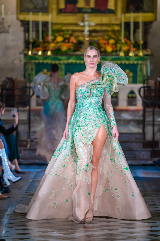 Michael Cinco presented his new collection during Paris Fashion Week at the American Cathedral in Paris, one of the most beautiful Gothic Cathedrals with colorfull stained-glass windows transformed in a perfect fashion venue for a such beautifull fashion show