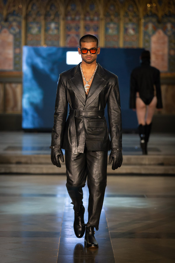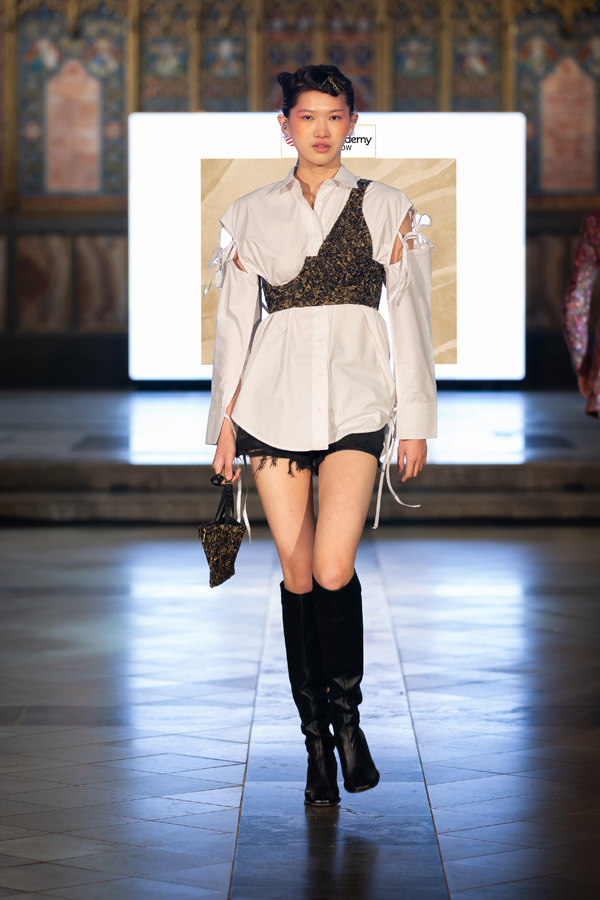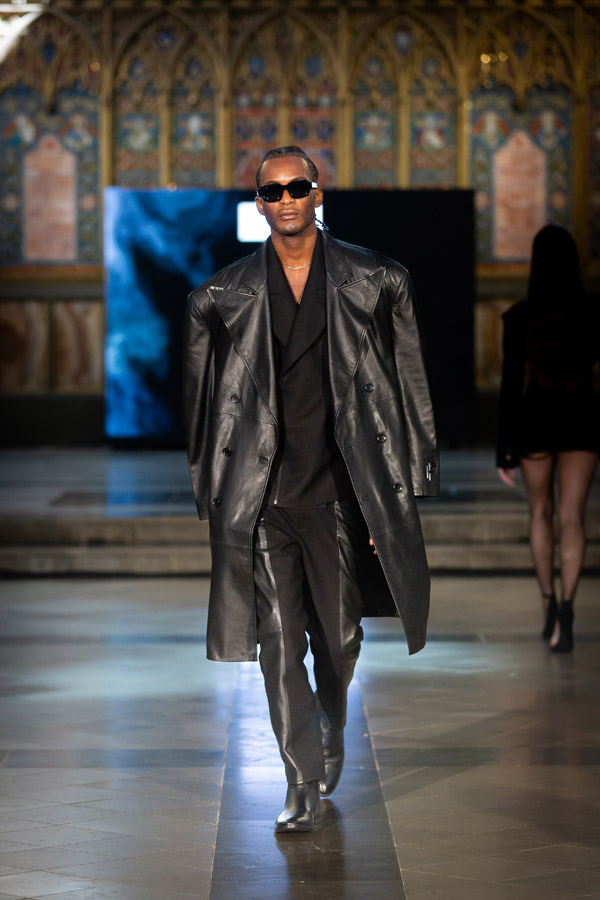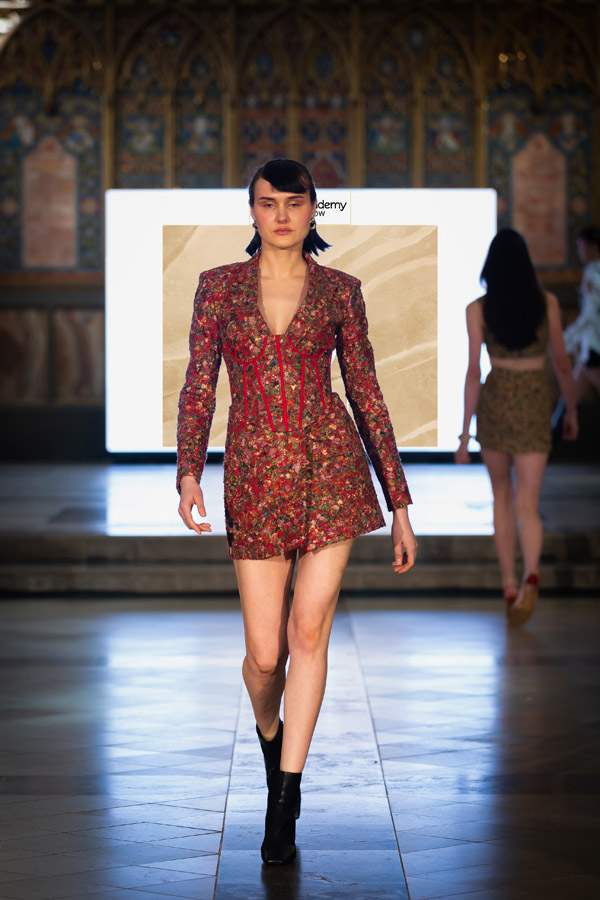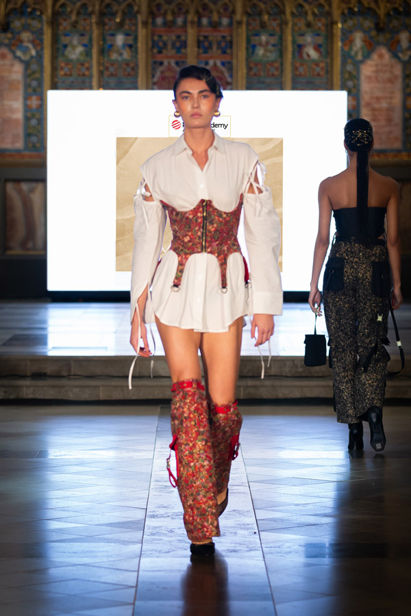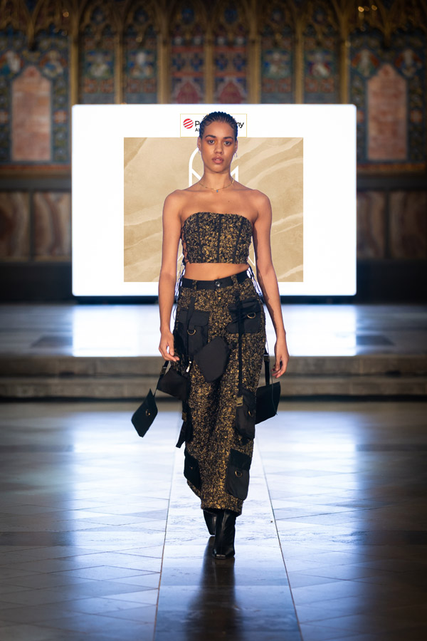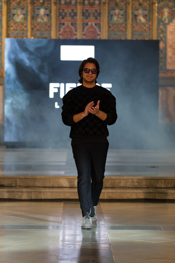 Shubh Goyal, Creative Director of FIERCE LONDON, a graduate of Fashion Luxury Brand Management from Pearl Academy presented the “Fierce Ascendancy” collection, an all-black line that combined luxury with the edgy spirit of streetwear. Crafted from fine leather, it included structured jackets, tailored trousers, and sculpted bodysuits, emphasising bold silhouettes and intricate details. This collection redefined streetwear with a focus on power, confidence, and unapologetic self-expression.