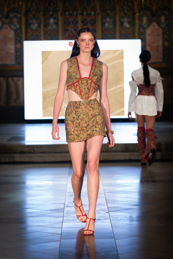 Saloni Arora, a Pearl Academy alumna who pursued Fashion Design, presented Label Muslin – a sustainable brand focusing on minimalist, multifunctional designs. The “Waste to Waist” collection showcases innovative corsets made from upcycled fabric scraps, combined with tailored shirts, trousers, and dresses. It blends traditional brocade with eco-friendly materials, redefining corsetry with a commitment to creativity and sustainability.