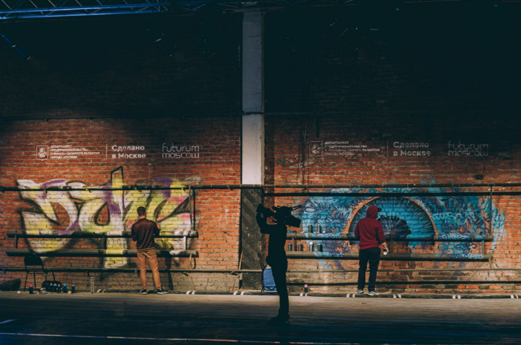 Artists J. Mars, Andrey Aznet and Sasha RTS aka RisuiTusui drew graffities live right on the Mosgormash walls. Sasha RTS, Andrey Aznet and Misha Vert made some unique VR-based works: inspired by the collections presented by the Moscow designers, the artists made some digital paintings in the Virtual Reality. In their turn, artists Alexey Novikov, Maxim Karadutov, and Egor Karpenko created a unique work of art – Object #04-0.02, a light installation with many differently sized squares, which was available right during the shows. Sound design for the livestream was made by Artificial Intelligence from MUBERT Team. Visual effects for the videos on the stream were designed by Stanislav Glazov, a digital artist.