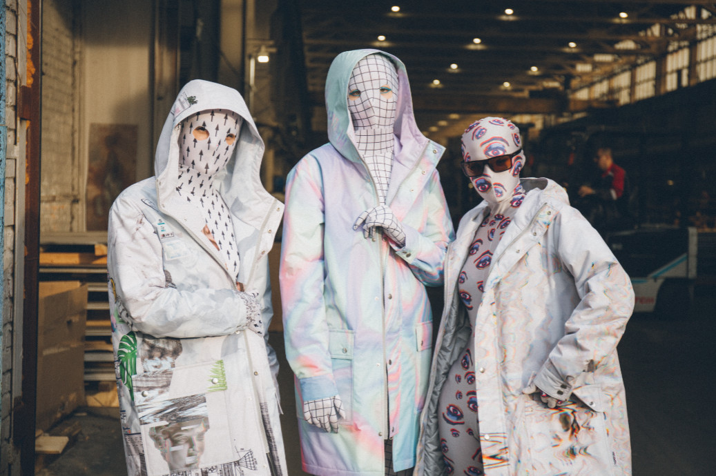 Clad in full-face anti-recognition masks, the models for the new GIDROPLAN collection strutted out in glitch-art “marble”-print coats, yin-yang print full body catsuits reminiscent of Marine Serre and raincoats printed with pastel visuals, vaporwave memes and Matrix-like imagery.
