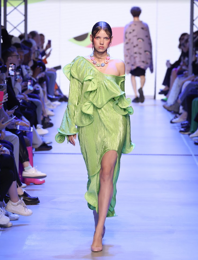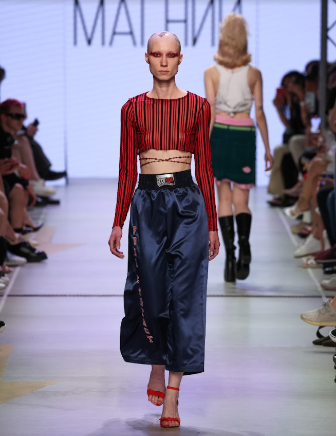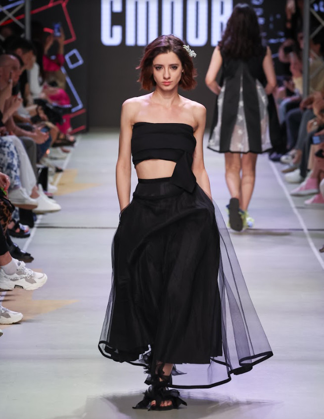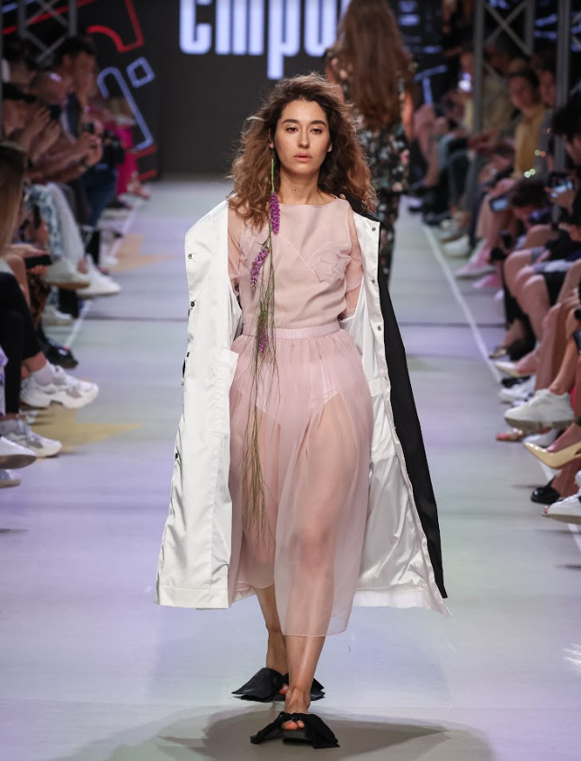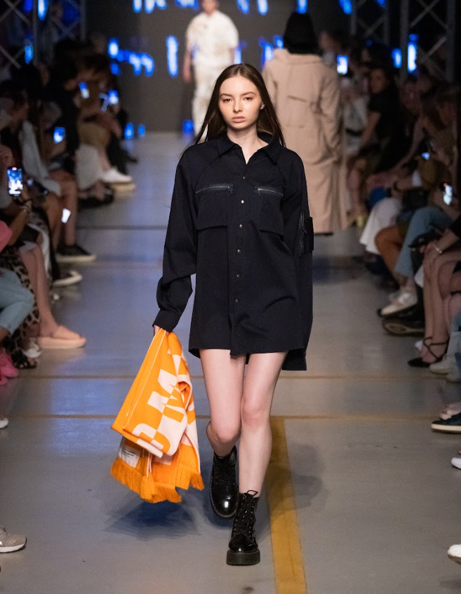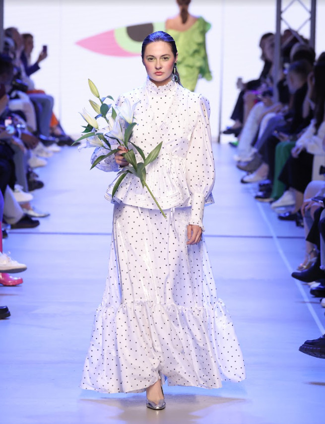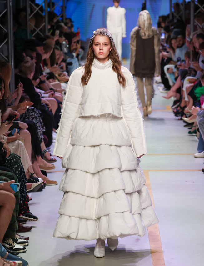 Emerging designer Dima Shapovalov presented the debut collection of his Dima Magny brand – Experiment 1.0. The basic concept of the collection covered upcycling, sustainable fashion, and garment merging. Dresses with different textures in every piece, mini skirts with abstract patterns, sweatshirts merged with denim coats, rollover skirts, floral boleros, tops, and jackets with unsymmetrical sleeves – these were worn by the models walking down the catwalk. Some of the garments featured natural colors, but then the designer added some spice of red, blue, turquoise, and yellow. According to the designer, every piece has its energy value. It might be the answer to why the collection looks so dynamic and diverse.