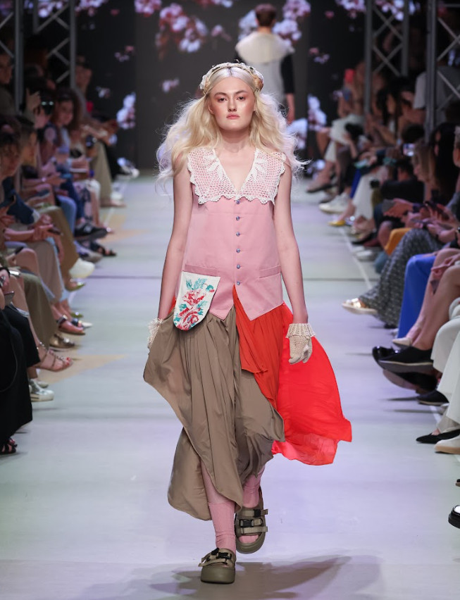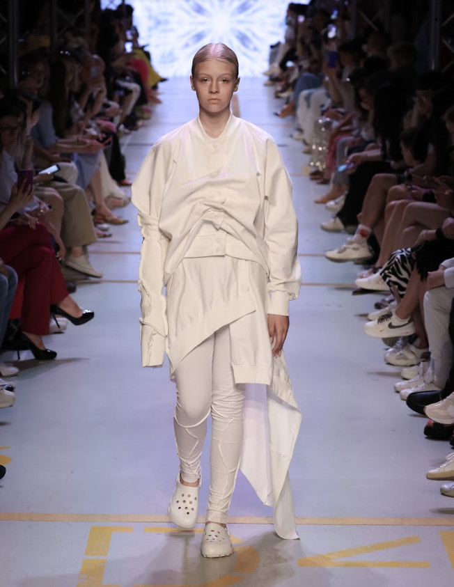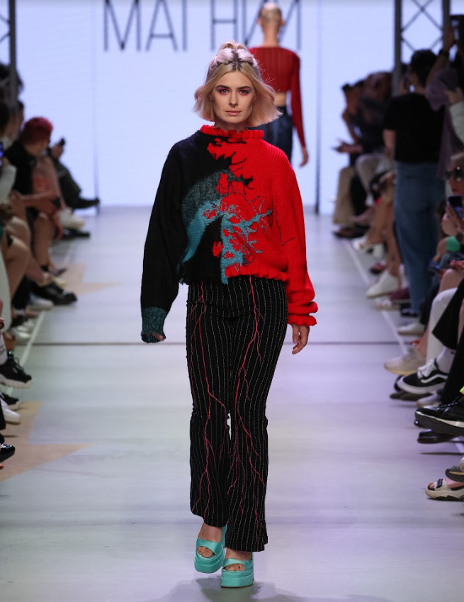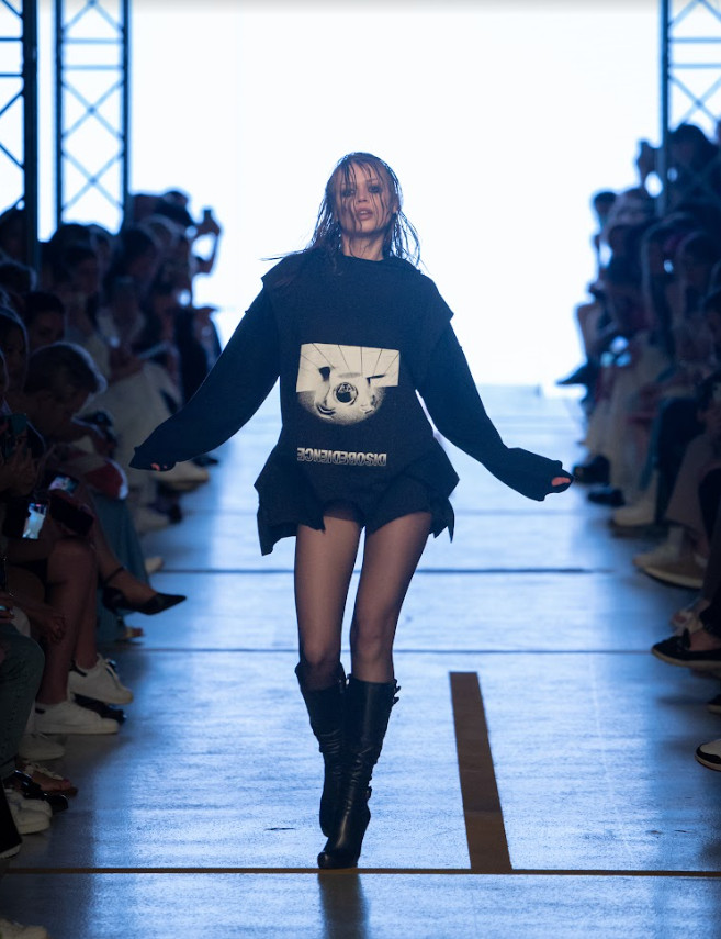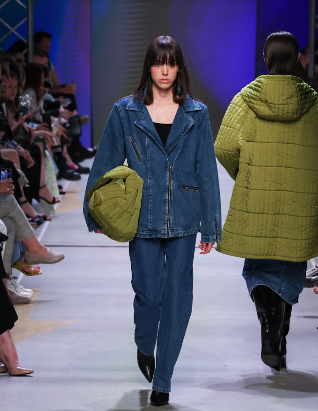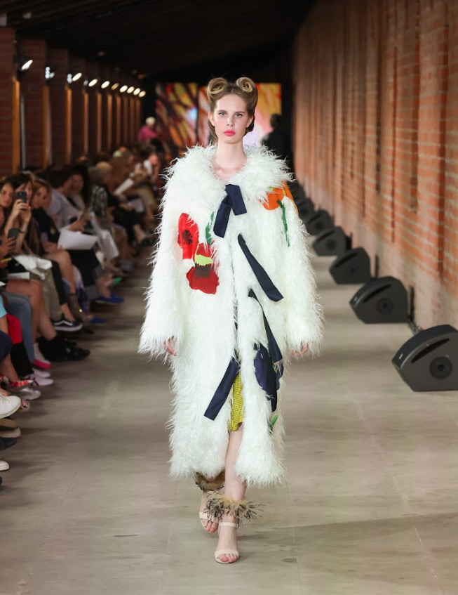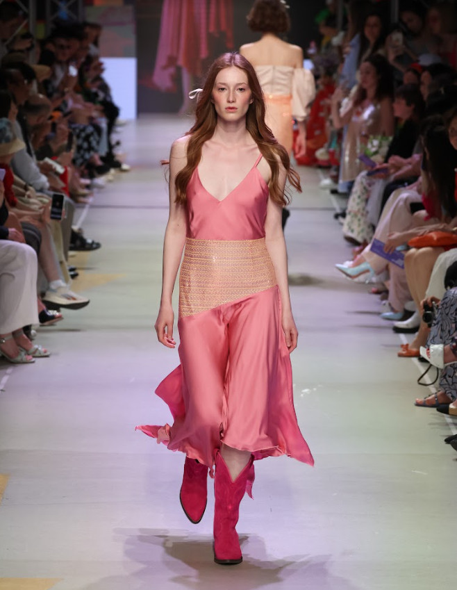 Emerging designer Dima Shapovalov presented the debut collection of his Dima Magny brand – Experiment 1.0. The basic concept of the collection covered upcycling, sustainable fashion, and garment merging. Dresses with different textures in every piece, mini skirts with abstract patterns, sweatshirts merged with denim coats, rollover skirts, floral boleros, tops, and jackets with unsymmetrical sleeves – these were worn by the models walking down the catwalk. Some of the garments featured natural colors, but then the designer added some spice of red, blue, turquoise, and yellow. According to the designer, every piece has its energy value. It might be the answer to why the collection looks so dynamic and diverse.