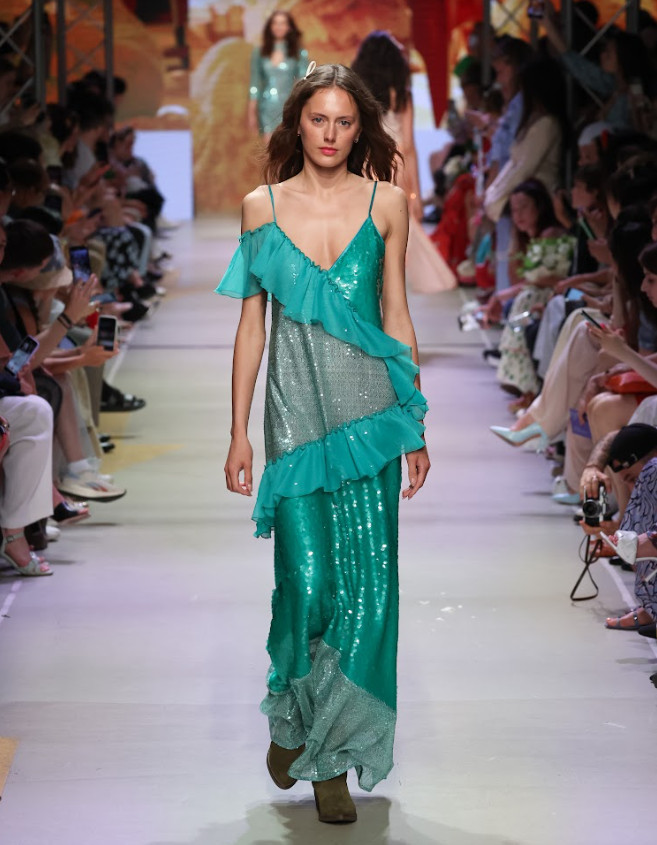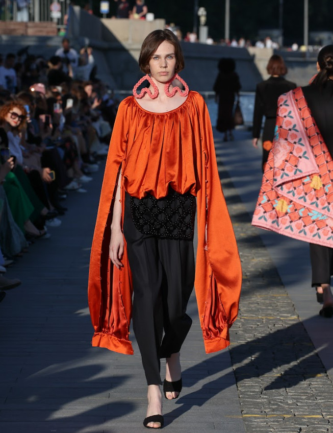 A whole universe in a single woman – the new collection by ESTER ABNER was dedicated to the symbol of life and love, which any girl is. The show was presented at the Floating Bridge in Zaryadye, and the main focus of the collection was on the game of contrasts and textures. Vivid hues of the collection – green, neon yellow, pink, peach pink, red, silvery, and blue – went so perfectly well with sequins under the rays of sun going down. Precise cuts, stability of shapes, and elegance – the collection followed the best traditions of the brand. At the catwalk, the show goers saw mini dresses, shiny evening garments, dresses with asymmetric hems and decollates, classic jackets with wide shorts and pants, and even some wedding looks. The list of accessories included extensive flowers and neckpieces, laconic chokers, as well as sunglasses. The show stopper was a model in electric orange semi-transparent dress decorated with feathers.