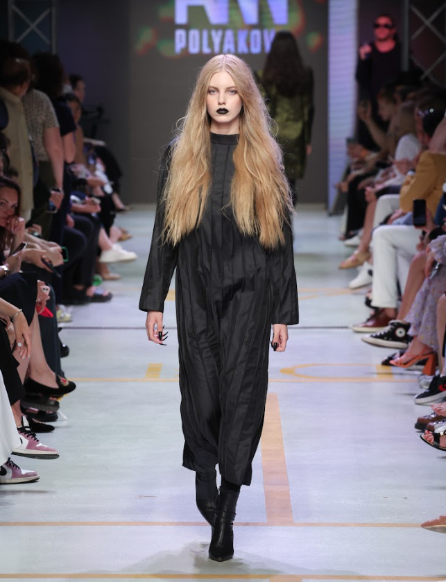 The show by ANNPOLYAKOVA, a Krasnoyarsk-based brand, closed the last day of Moscow Fashion Week. In her collection, the designer reconsidered Siberian historical codes and fused them with Avant-garde. The resulting garments were rich in architectural details, lots of layers, and abstract cuts. At the catwalk, the audience saw a true fashion show with posturing and a concept. Men joined the female models – although they also made appearance in women’s wear. Extensive dresses, tops, and skirts looked well on men, too. All the garments featured 4 colors – the prevailing black with vivid accents of gold, khaki, and electric blue. Semitransparent straight dresses, high-waste pants, overcoats as if borrowed from men, straight jackets of noble fabrics – the designer believes that piece on the collection would do to conquer the world. The bright highlight of the show was a vogue dance in a bright blue dress with golden inserts.