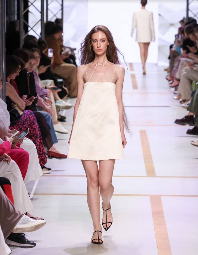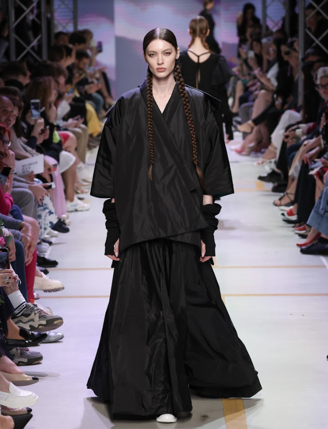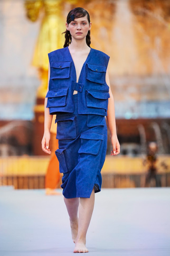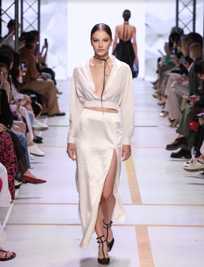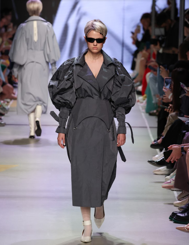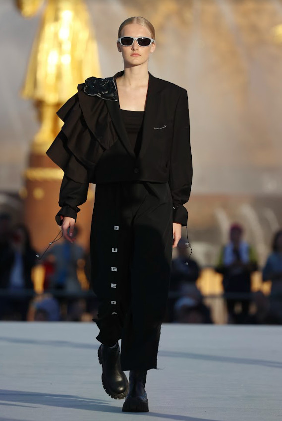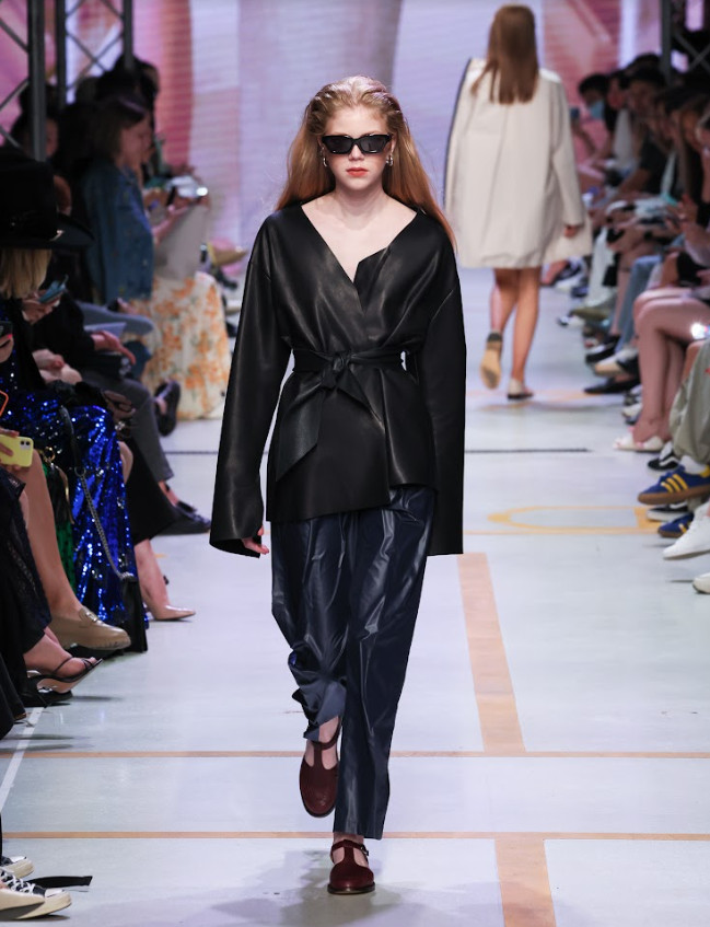 This emerging brand follows the sustainability vector. They use only natural stuff and recycled package to make clothes. At the show, the brand presented pieces from two collections at once – Convoité and Éclat de beauté. Basic colors were white, black, and light beige. Corsets, puffed sleeves, and zephyrous skirts of translucid silk organza ensured the overall romantic spirit of the collection. Besides childish tops and dresses, LUBOVI also brought basic tops and shorts of texturized recycled cotton, a minimalist A-cut dress, and laconic lapel-free jackets.