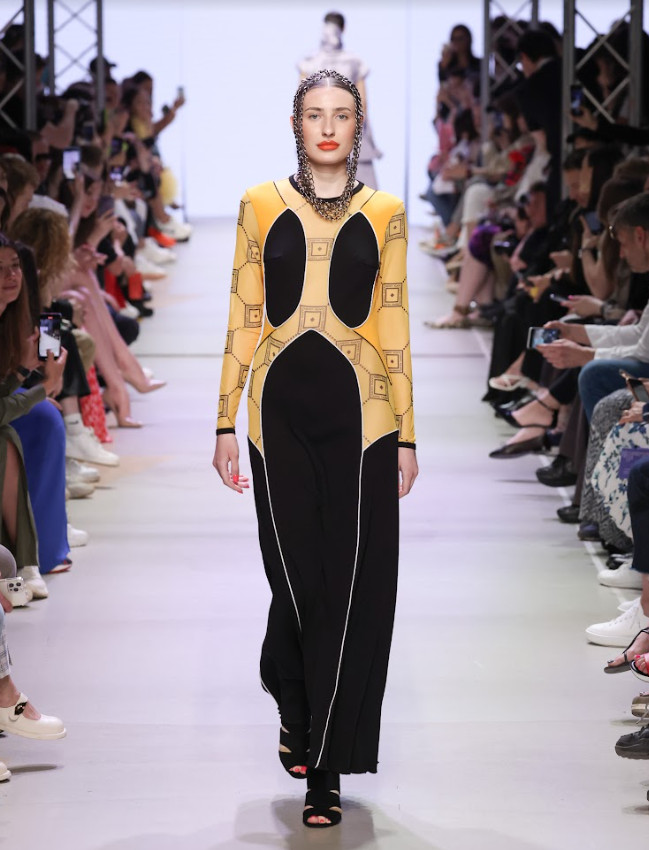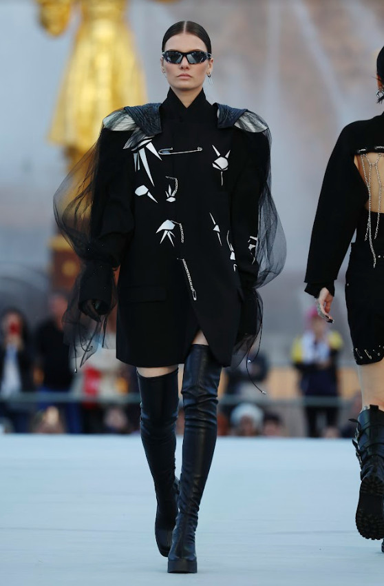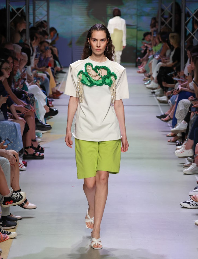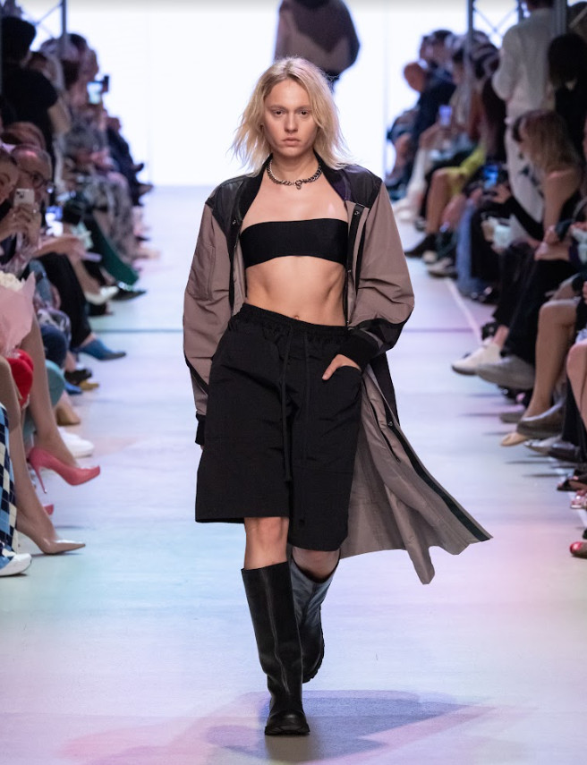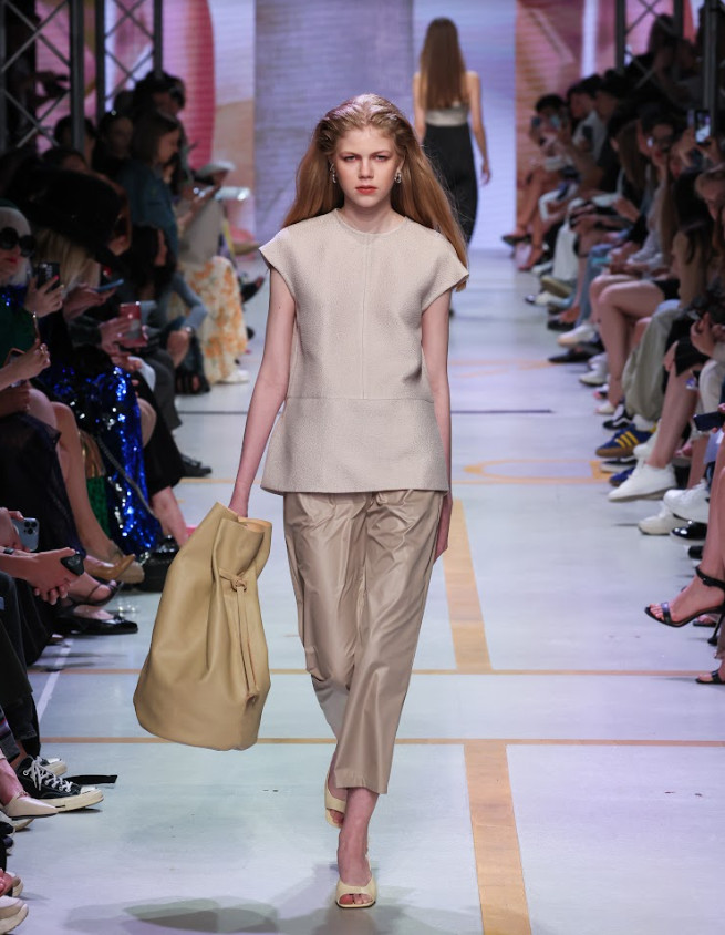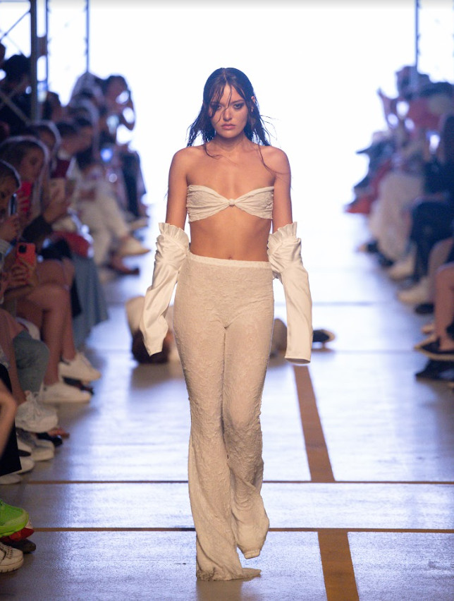 This emerging brand follows the sustainability vector. They use only natural stuff and recycled package to make clothes. At the show, the brand presented pieces from two collections at once – Convoité and Éclat de beauté. Basic colors were white, black, and light beige. Corsets, puffed sleeves, and zephyrous skirts of translucid silk organza ensured the overall romantic spirit of the collection. Besides childish tops and dresses, LUBOVI also brought basic tops and shorts of texturized recycled cotton, a minimalist A-cut dress, and laconic lapel-free jackets.