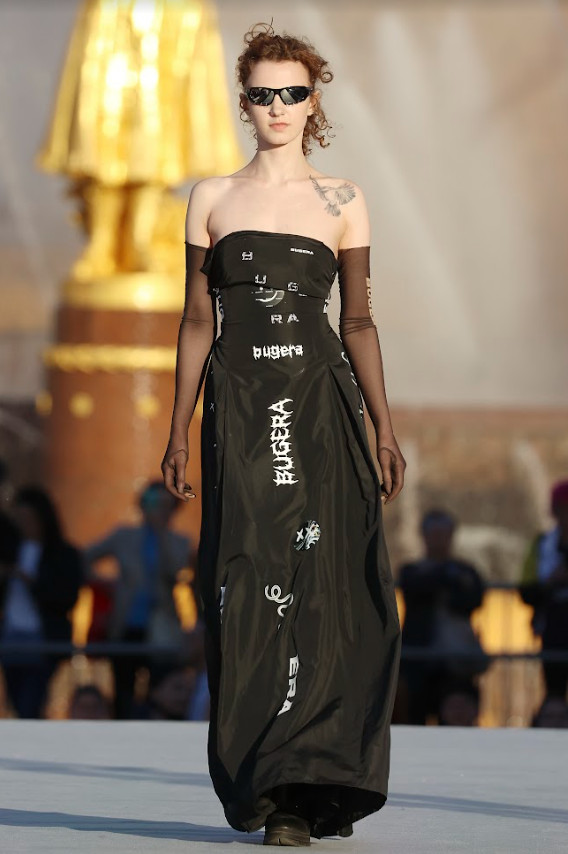 The Russian-Georgian brand founded by Arthur Vasiliev in St. Petersburg presents engineering accuracy and the best fabrics, contrasting and unique, a fusion of different arts, including design and architecture. At Moscow Fashion Week, the brand presented a collection featuring a suede fringed coat, leather pants, a dress that resembled a madman’s tuxedo, cropped vests, skirts with asymmetric hems, a shirt with a printed human face, a dress with organza hem, and so many other things. Basic colors of the collection were black and white, contrasting with red and green prints – skulls or circles. The show was accompanied by offbeat flashing lights, and the opener featured the text ‘Your eyes, your lips, your skin – I feel it, I love it, trust me’. The stopper of the show was a striking paper-like dress.