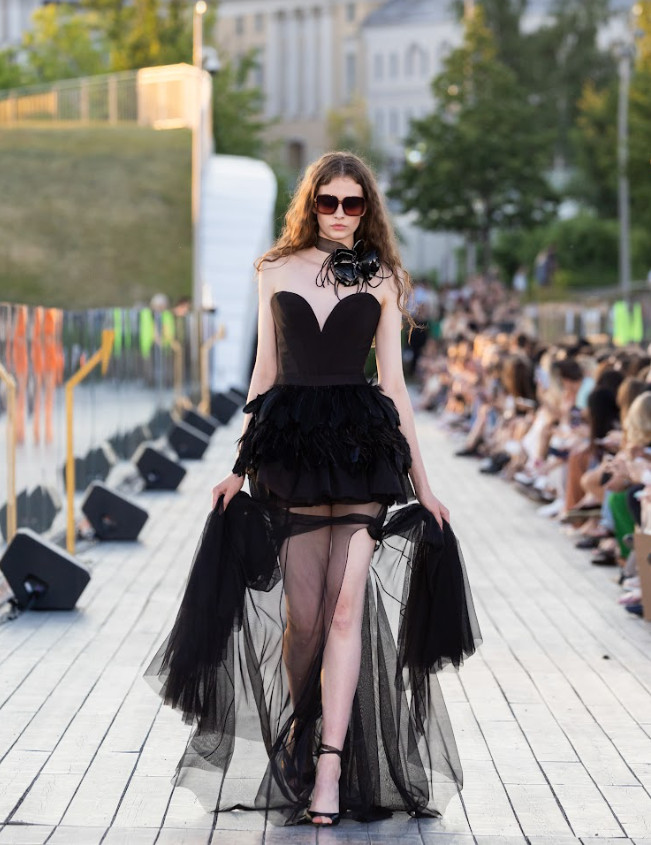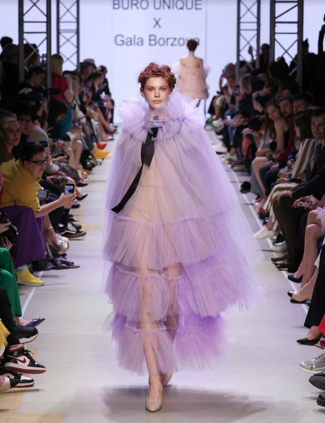 The brand presented its Spring Summer 2023 collection designed in collaboration with stylist Gala Borzova. The alpha material of the new line is airy veiling, which was used to create gowns with tier-like and multilayer skirts, romantic blouses with rouches and extensive sleeves, as well as mantles with ruff collars. Tinsel, nets, marabou feathers, and other sophisticated materials made a suitable set with it. Besides midi party looks, the collection also featured cocktail jacket dresses, tops, and shorts. This is a story of friendship and collaboration between gifted designer Alyona and top stylist Gala. Light veiling and nets, complex textures, unconventional cuts, and tinsel – this is how the new collection by BÜRO UNIQUE X Gala Borzova can be described in short. Crazy Couture – this is what it is.
